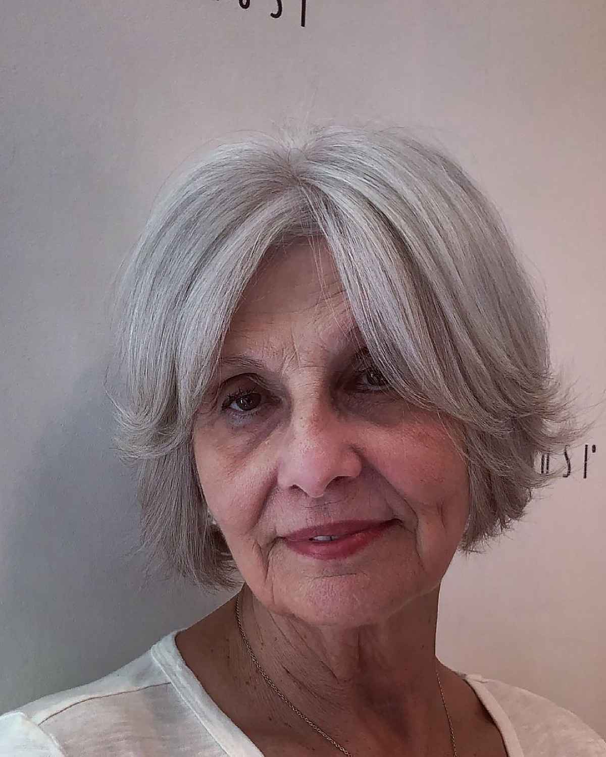 Wearing a pulled-back lob with mid-length bangs for women over 70 keeps things simple. Bangs can be any length that compliments a woman’s eyes, face shape, and lob length. Cuts with curtain bangs allow face-framing with a low ponytail, a twist, or a half-up style.