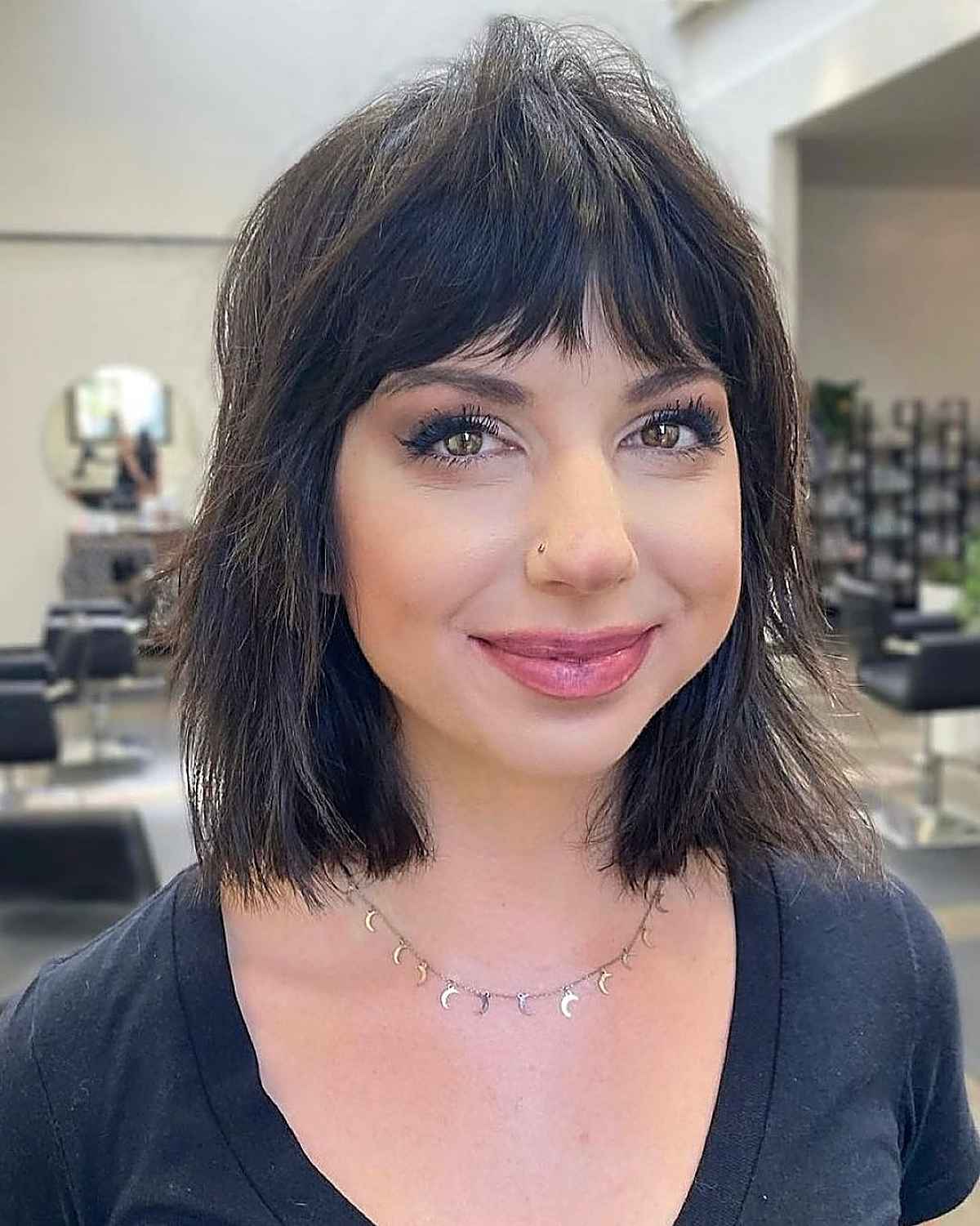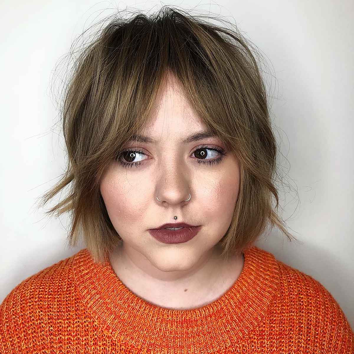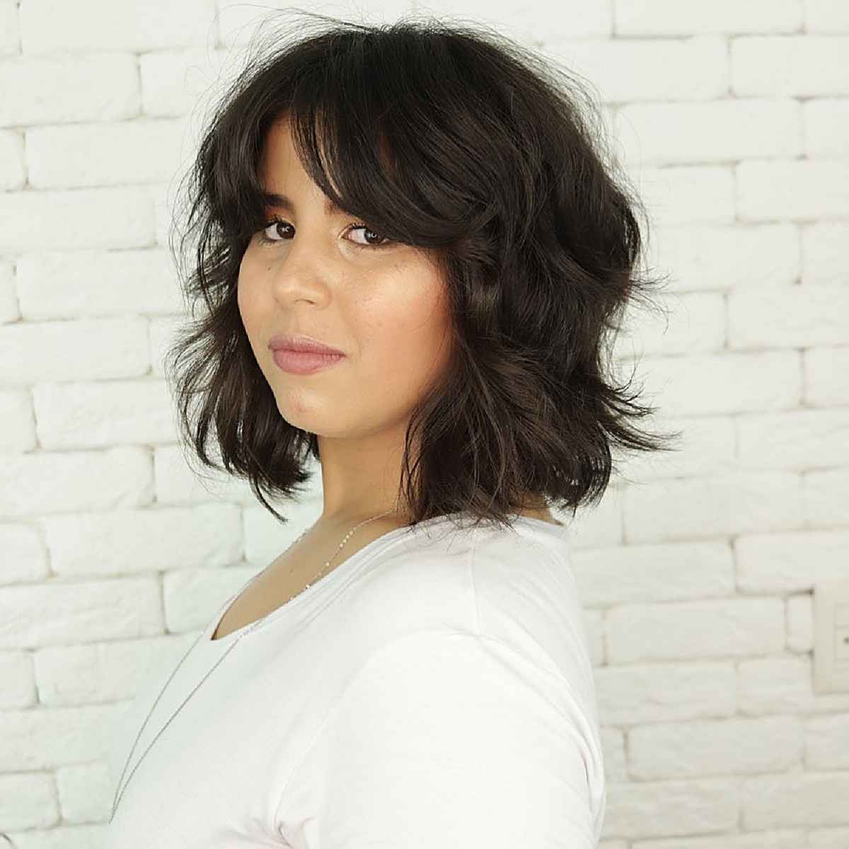 A shoulder-length shag with side-swept bangs can be an excellent choice, particularly if you have curls or fine hair. Haircuts designed for round faces often create a more elongated look, and this cut is perfect for that. This style is ideal for those of you who appreciate tousled hair!