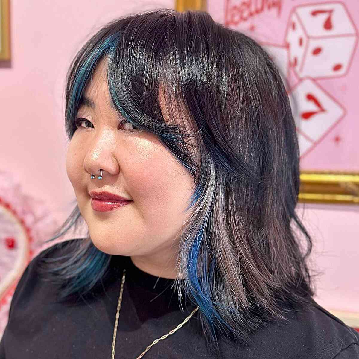 For a playful, adaptable hair color, aqua peekaboo accents are ideal. They even come with a curtain fringe! The peekaboo technique allows you to conceal the aqua tint or reveal it, depending on your plans for the day. With this look, your hair can appear both classic and daring!