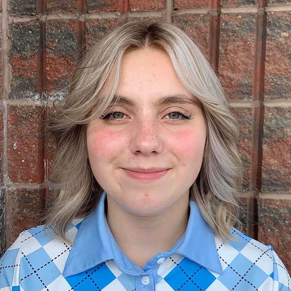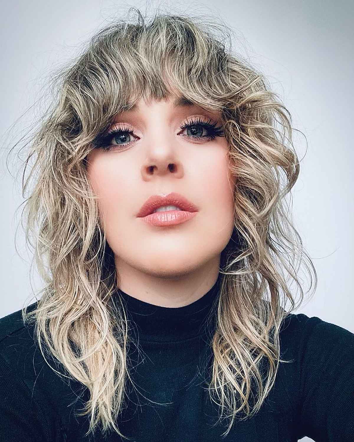 Opt for a textured blonde shag with curtain bangs for a chic makeover. Curtain bangs for wavy hair enhance volume and depth instantly. Rock a new vibe with your style! Complete your look with a dry texturizing spray for that effortlessly tousled finish.