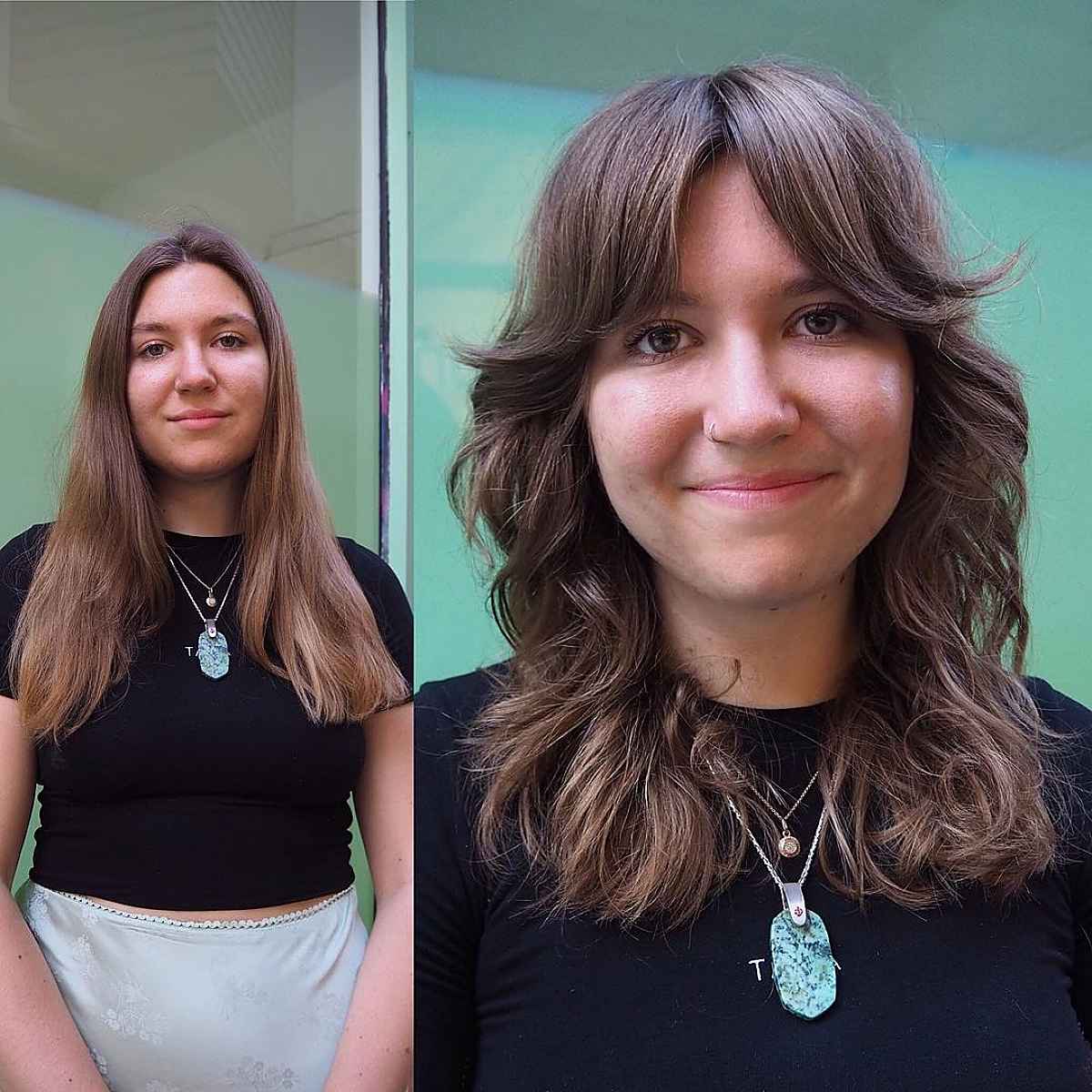 Wavy long curtain bangs evoke the essence of a 70’s shag when smoothly integrated into face-framing layers. If you desire hair that’s wavy with bangs, consult your stylist about enhancing the natural curl to maintain an effortless styling routine. Employing a curl potion and drying to around 75% will help prevent frizz. When drying curly hair, avoid overhandling as that can lead to flyaways.