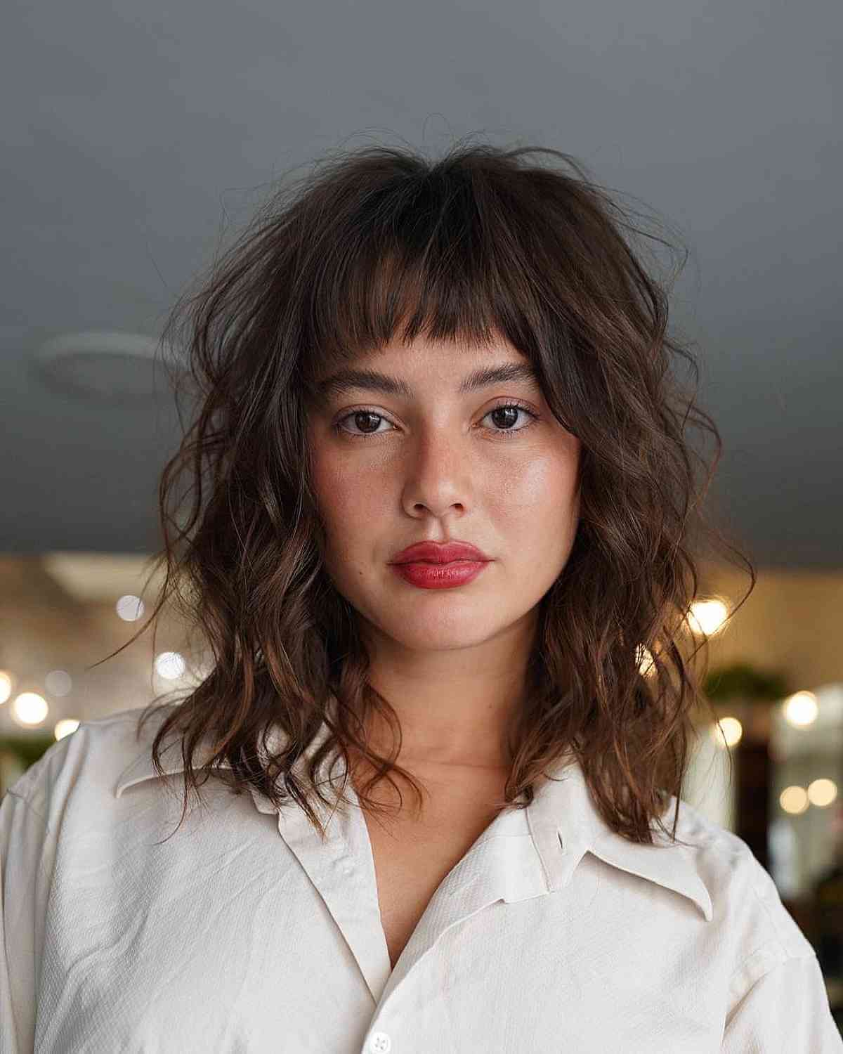 Consider medium-length wavy hair with bangs if you are ready to embrace a 70’s-inspired shag. A wavy hairstyle with bangs is effortless to style if you’re a woman on the move. Blow-dry your hair forward from the crown and loosely curl large sections. Separate with a soft pomade for a relaxed finish.