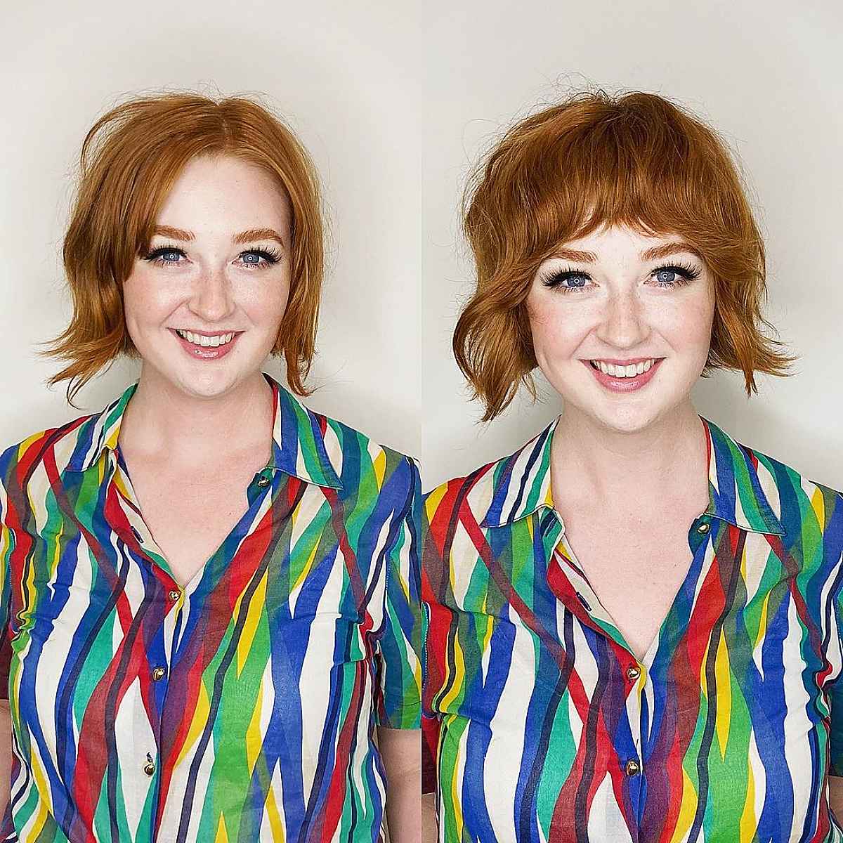 An effortlessly chic bob with casual bangs is perfect for women with thick tresses. Talk to your stylist about carving out layers to highlight natural waves. Wavy hairstyles with bangs enhance a variety of hair types. Style your hair forward from the crown and piece out the shorter curtain bangs using a molding paste for a light hold.