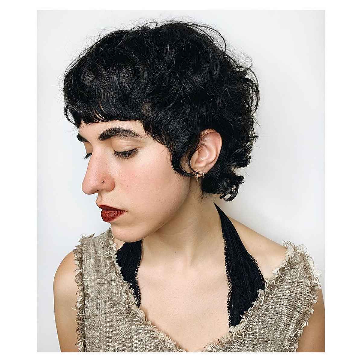 A modern pixie bob with bangs will definitely attract attention! Numerous layers and a perimeter cut about an inch or so from your hairline gives wavy hair and bangs a revitalized appearance and enhances facial features. Maintain sufficient length in the back to showcase naturally curly hair.