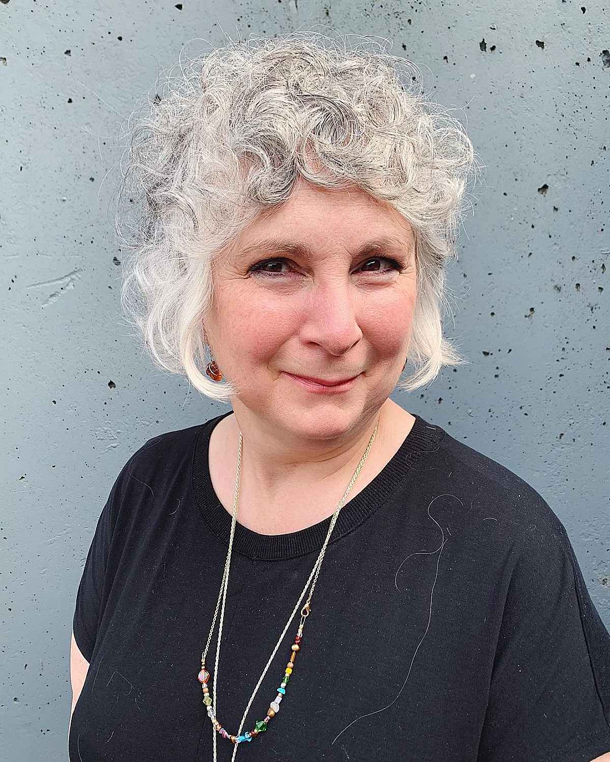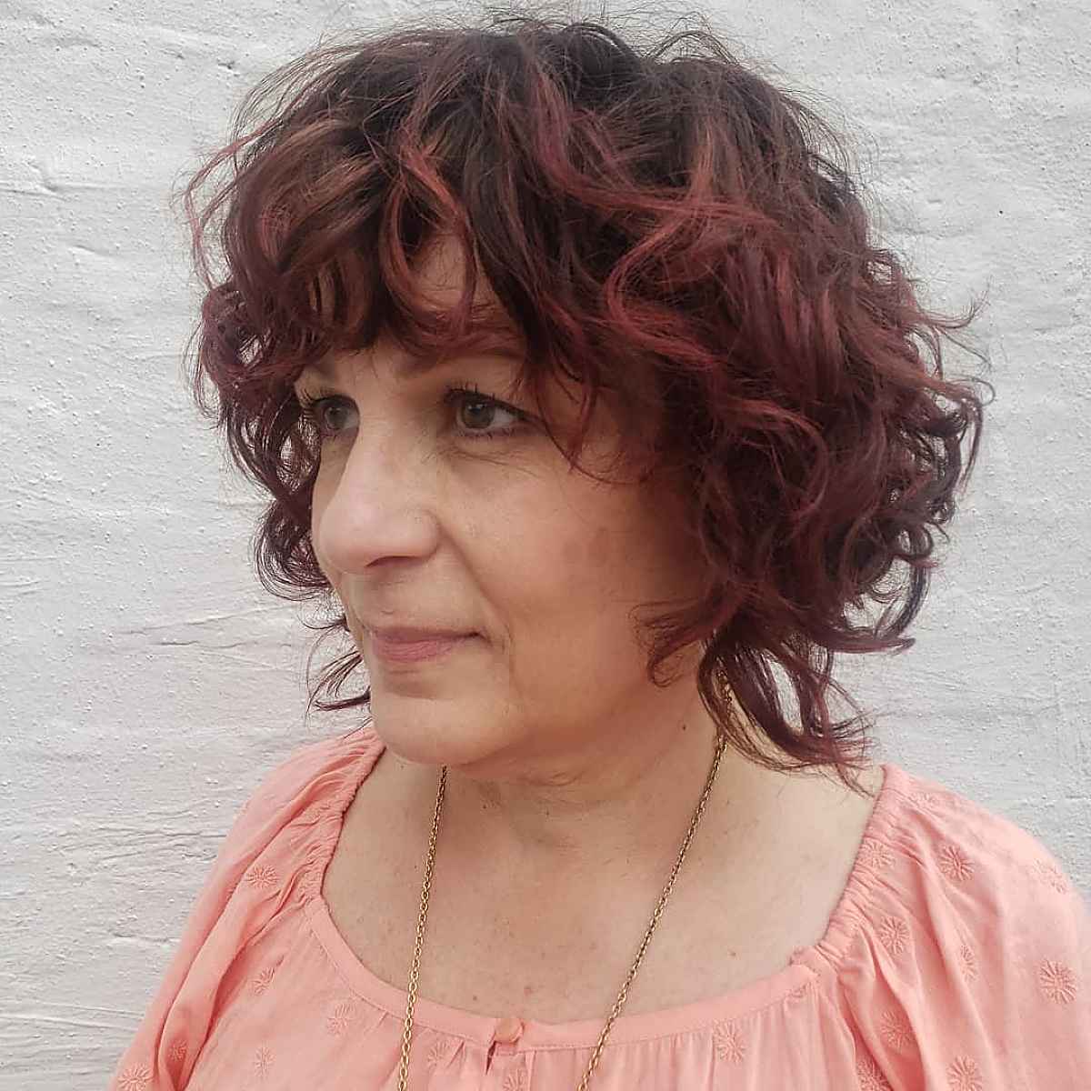 A shaggy hairstyle with wavy fringe for women over 50 is a great option if your hair is fine. Thinning hair can be made to appear more voluminous when pulled forward from the crown. Notice the curls look bouncy and full in front. Diffuse hair after using a curl cream and then finish with a light paste to place curls where you want them.