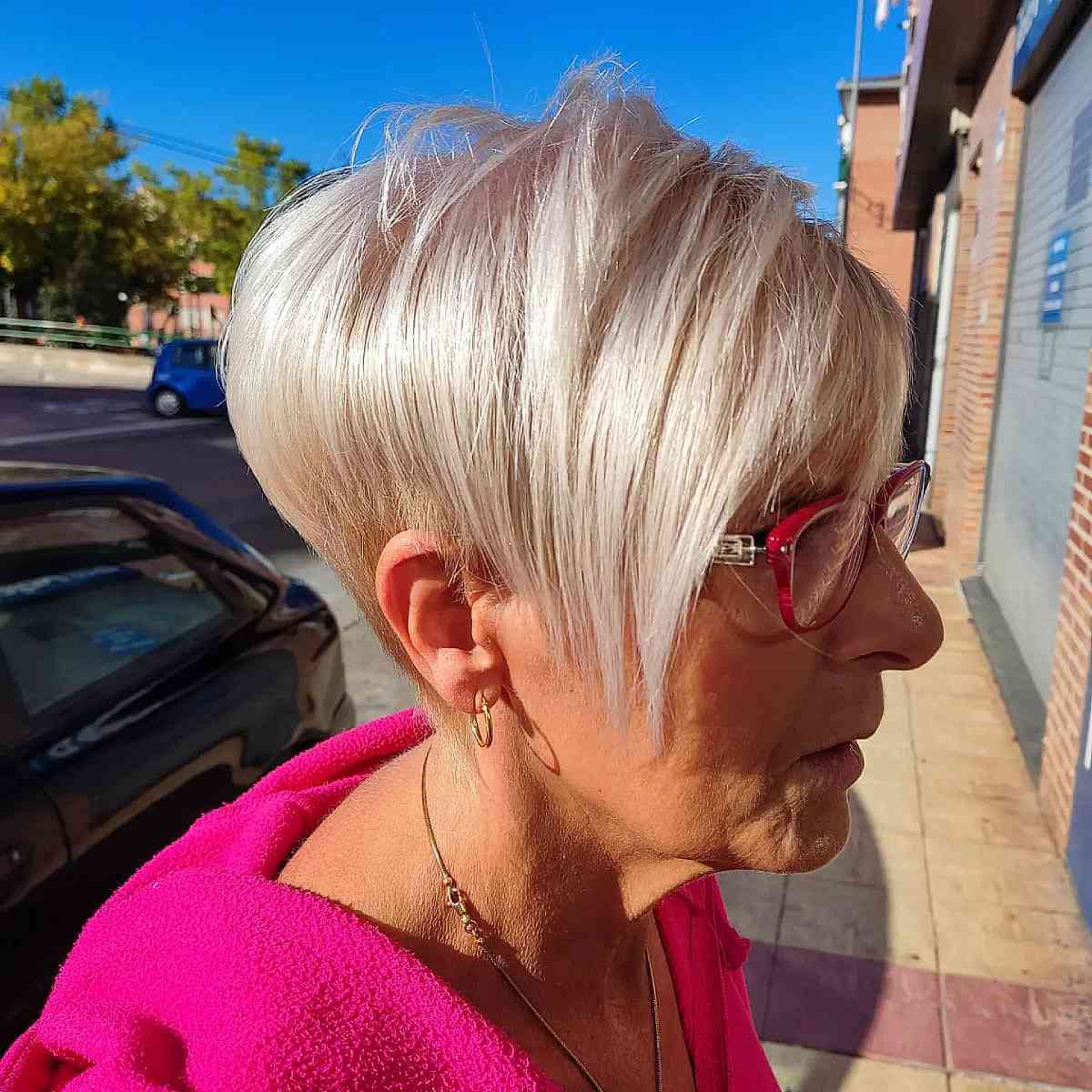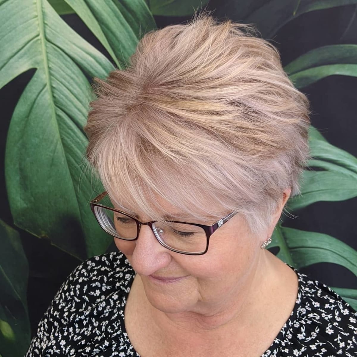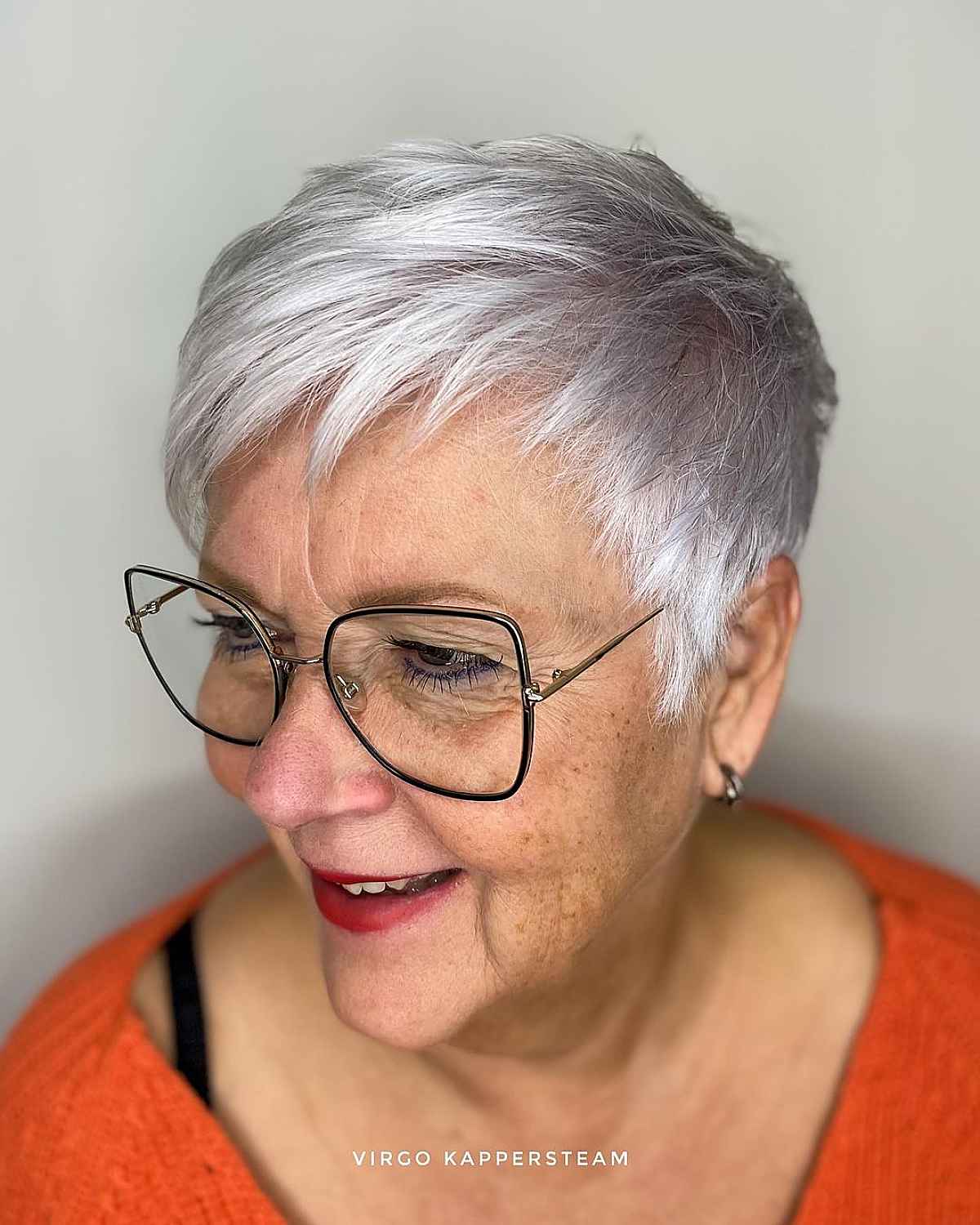 Feathered Pixie Hairstyle for Mature Women Who Wear Glasses