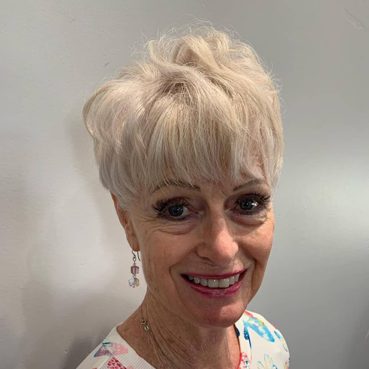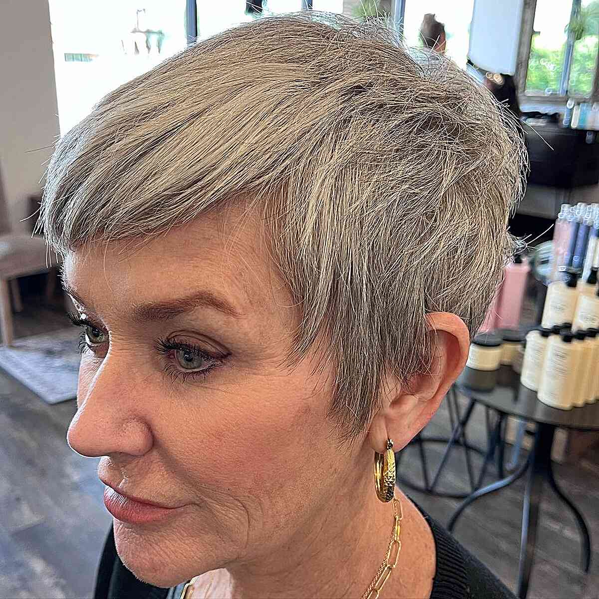 Say hello to the chic brushed-forward fringe on a pixie cut! This look is ideal for mature women who want to stay trendy and stylish, as it is elegant and contemporary. Be aware that pixie cuts tend to require a bit of upkeep. You might need to visit your salon every four weeks for a trim and shaping. To maintain the style, use a round brush and blow dryer to give your hair some volume and movement.