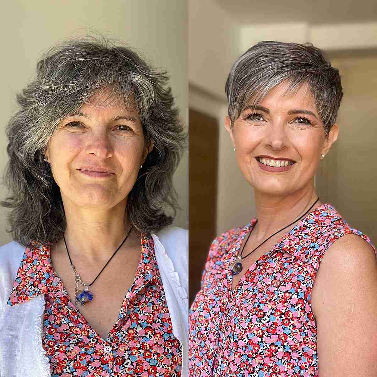 An elegant salt and pepper pixie cut looks amazing for women with natural shimmer. A rounded pixie is perfect for those seeking height and volume. Embrace your natural hues with confidence and feel beautiful every day.