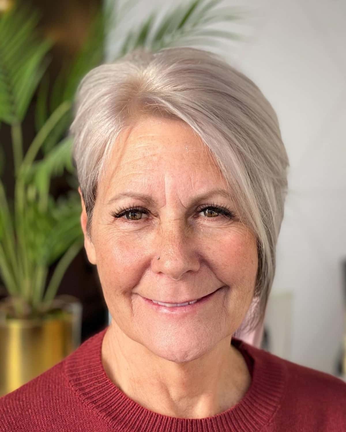 Add two striking elements with a pixie cut for fuller women over 60 featuring silver hair. Gray hair tends to become finer as we age, so a pixie adds vitality back. Pushing all the movement to the front of the face works well, disguising any concerns with recession areas. It also frames the face for an elegant style.