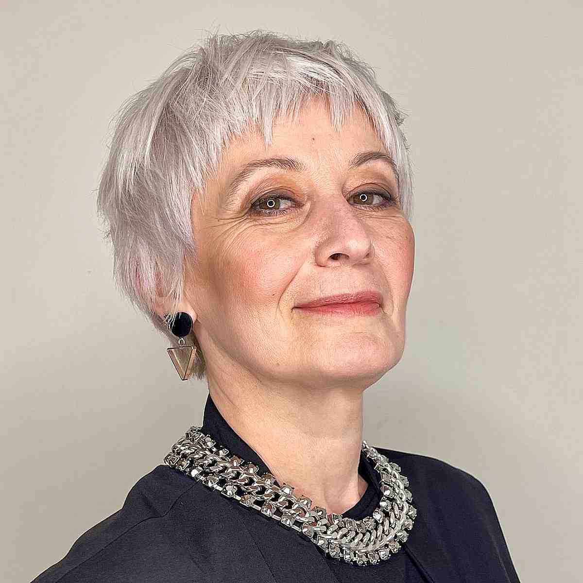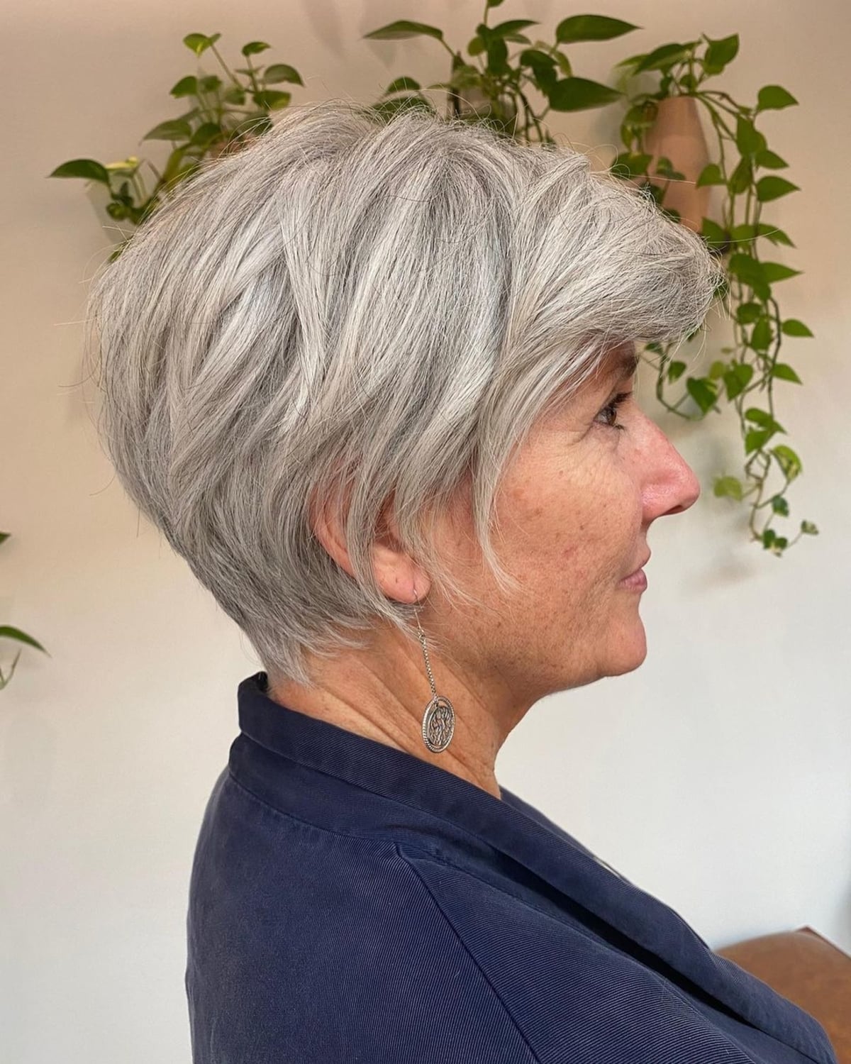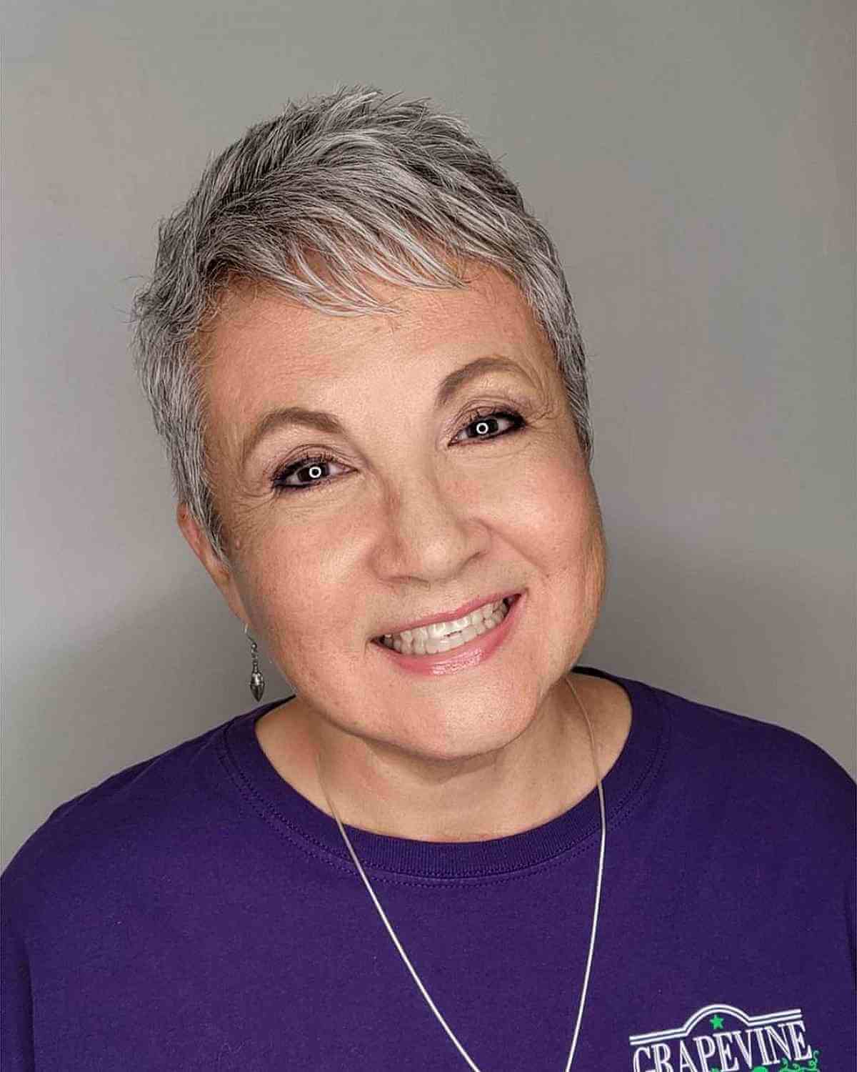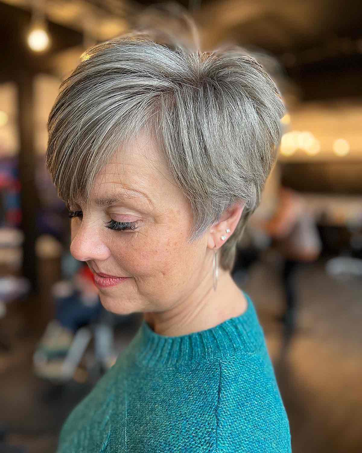 An elegant gray pixie cut should appear effortless and stylish without much effort. While it only takes a few minutes to elevate this hairstyle, the ideal look for this chop features a piece-y definition. Attain it using wax or salt spray to enhance the layers.