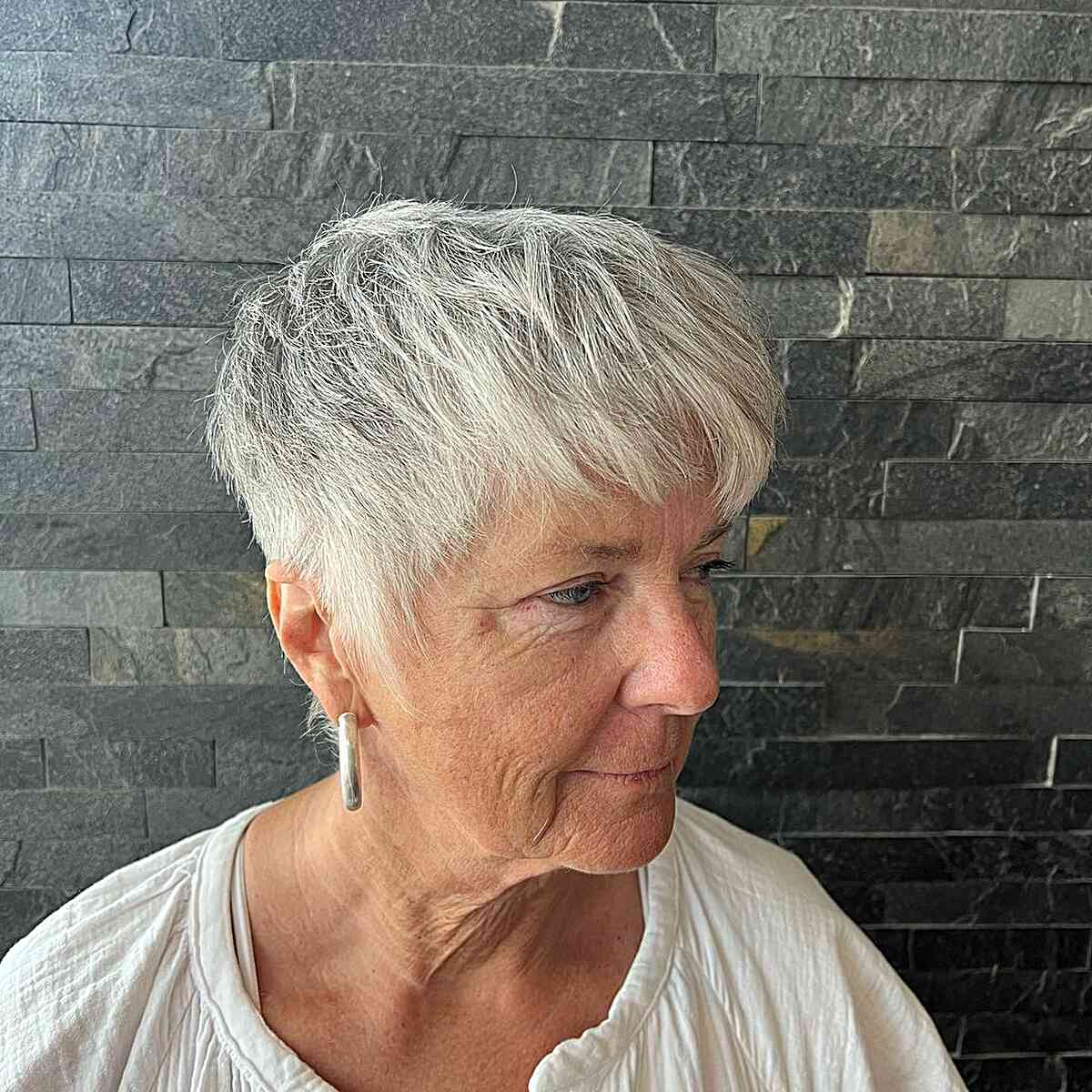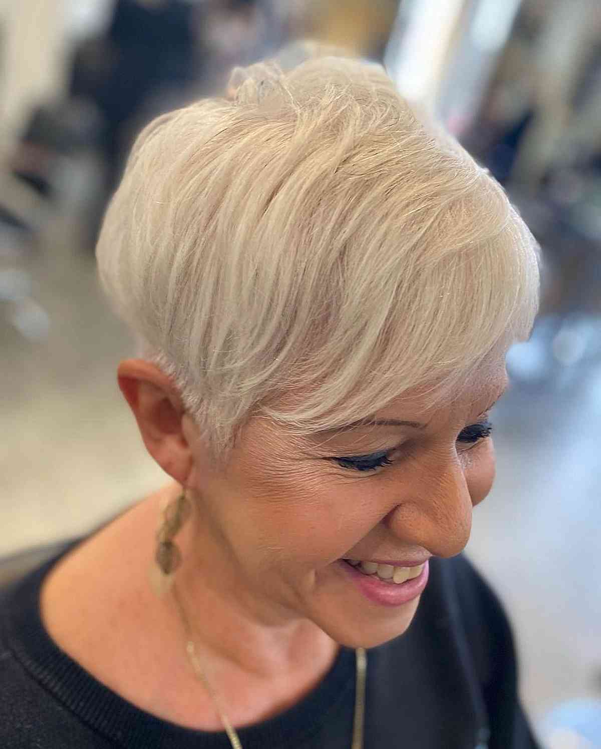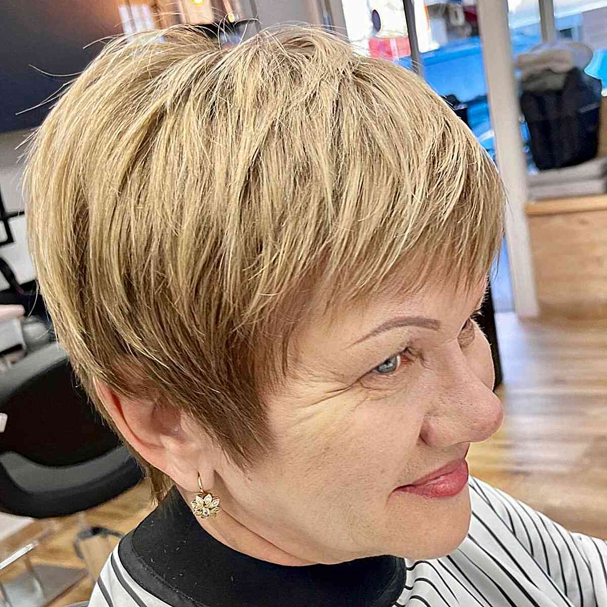 A pixie cut for seniors creates a sophisticated, streamlined hairstyle. The short length provides the hair with an illusion of increased volume. Short hairstyles for women over 60 with thinning hair, like pixies, are simple to style and appear natural with a gentle texture.
