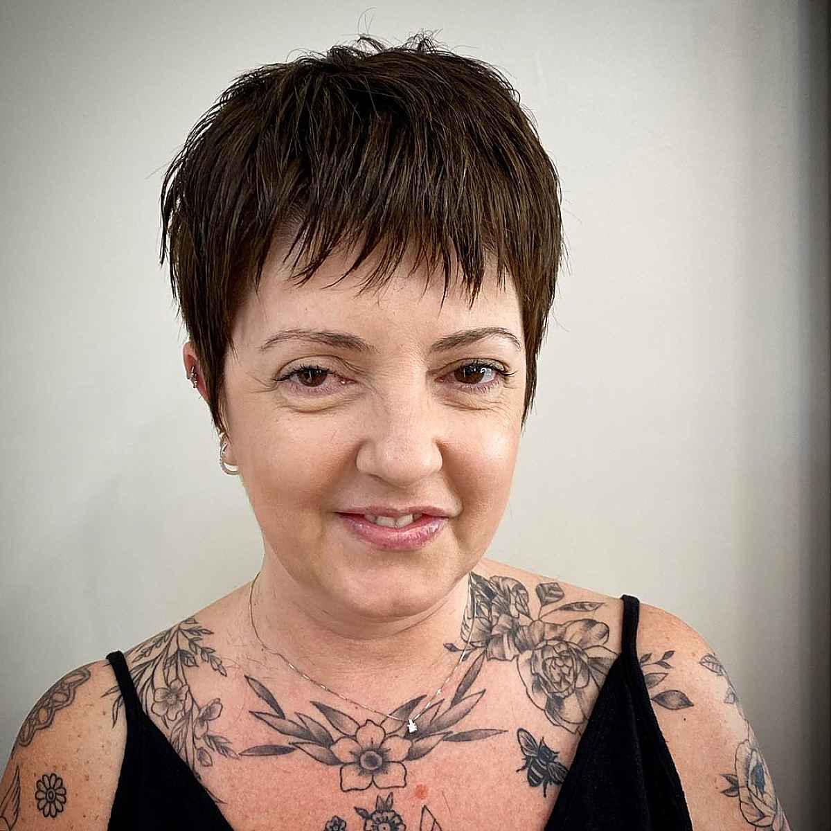 This elegant pixie hairstyle showcases airy bangs and layered texture with a feathered definition that beautifully suits women with fine to medium hair. The cropped length, paired with the gentle layers, enhances volume and fullness, ideal for thinning hair. The bangs softly frame the face, providing a youthful look while softening any sharper facial lines. This cut is low maintenance yet remains feminine, making it perfect for older women seeking a fresh and modern look.