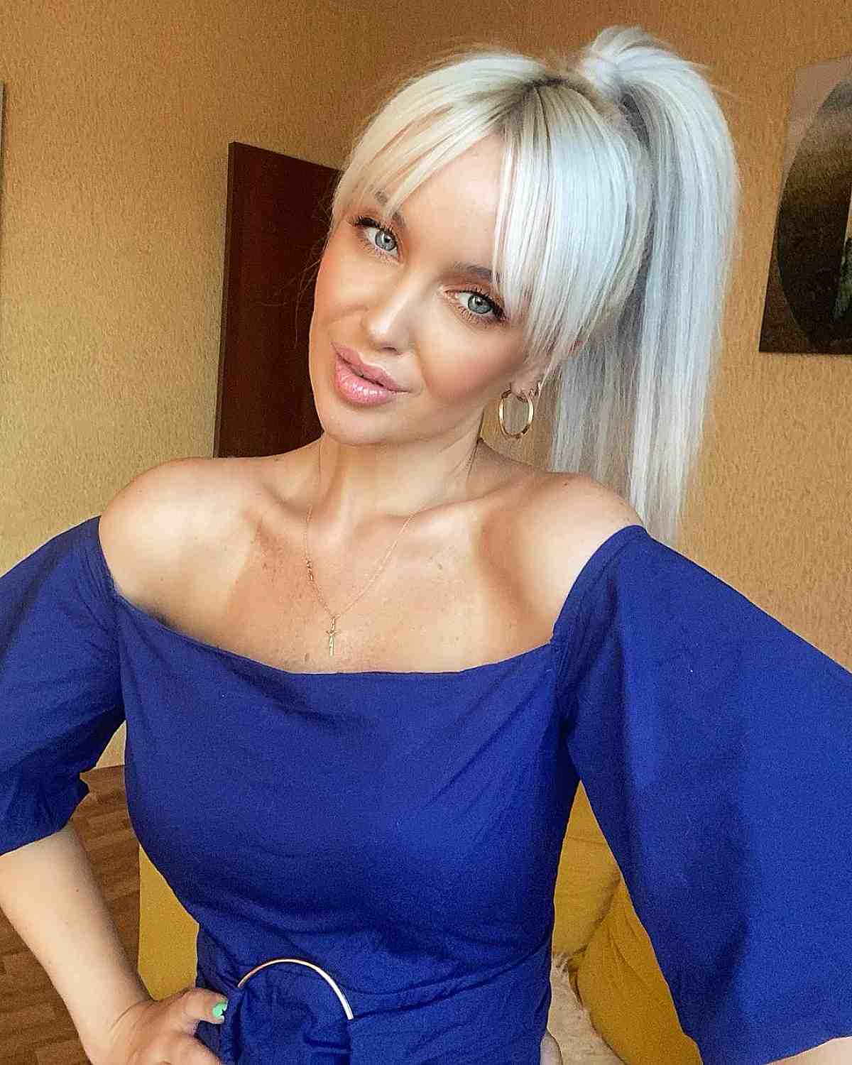 A ponytail with bangs makes for an excellent hairstyle choice. The fringe elegantly conceals your forehead while maintaining a chic and simple appearance. Dry shampoo can be utilized to ensure your cut stays fresh. Be mindful that the length of your fringe doesn’t irritate your eyes.