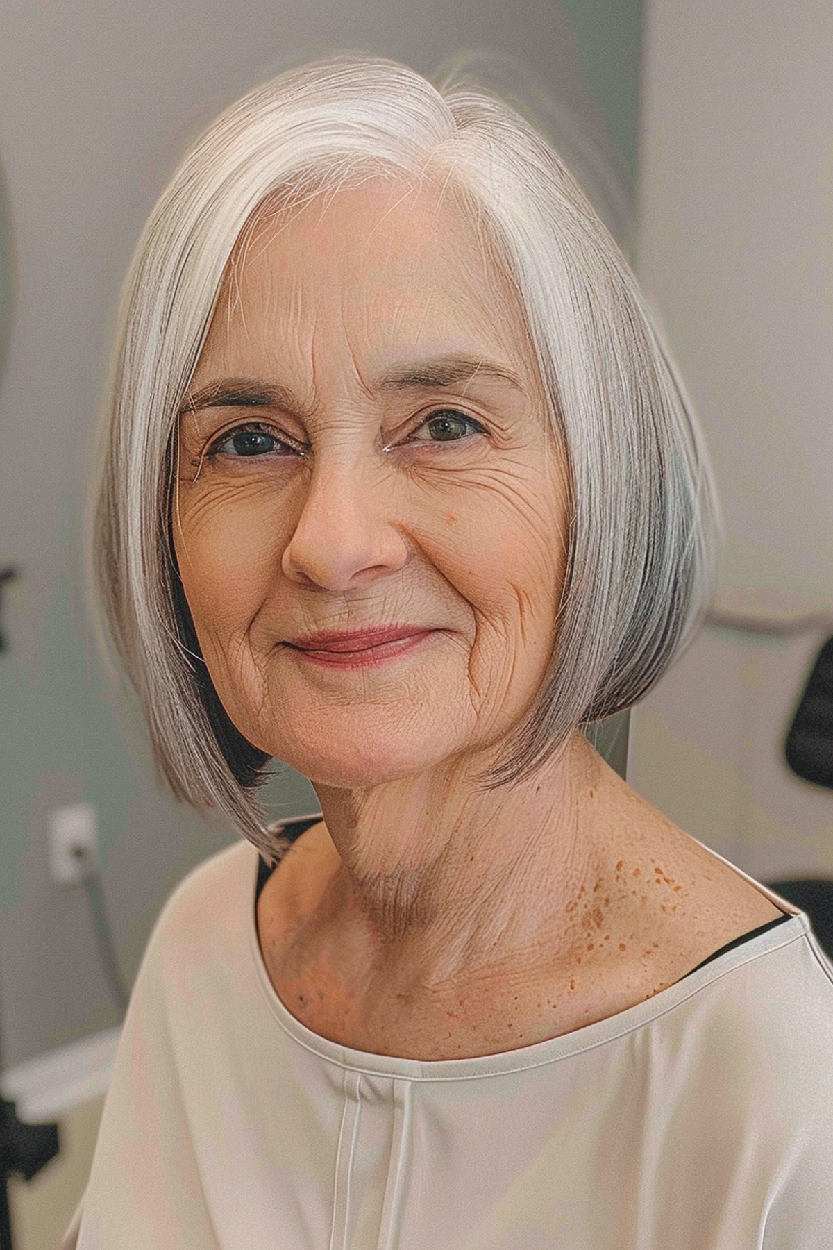 This stylish one-length bob is ideal for women over 70 aiming to celebrate their natural beauty. The sleek, straight cut frames the face elegantly, softening the forehead area. The style is low-maintenance and easy to manage, making it perfect for fine to medium hair types. The precision of the one-length bob adds a timeless and sophisticated touch, ensuring a polished look with minimal effort.