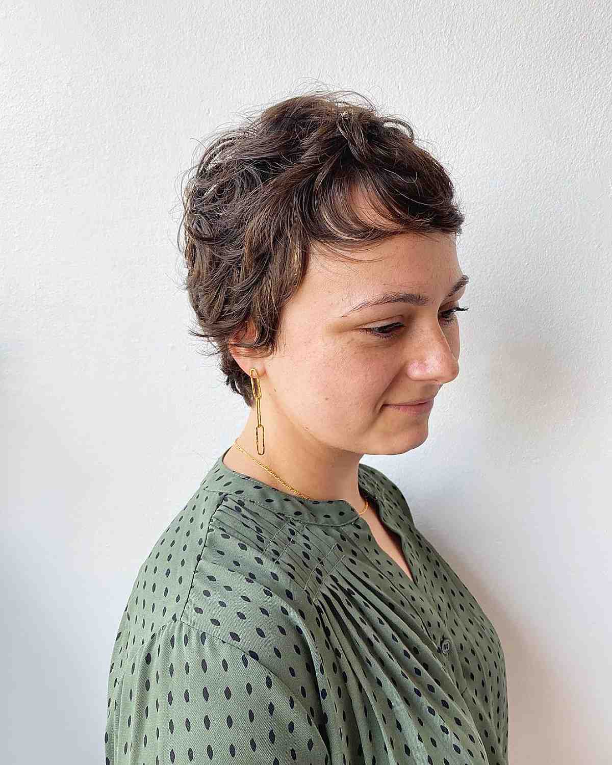 A chic messy pixie cut with bangs works well if you have wavy to slightly wavy hair. The ideal style for a prominent forehead has become easier over time. Ensure you leave the layers long enough to highlight your curls. It will provide you with a soft and tousled finish. Add a gentle curl booster like Ringlet by Redken for enhanced texture.