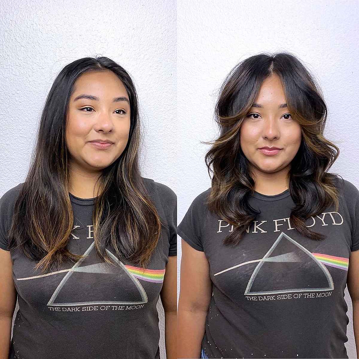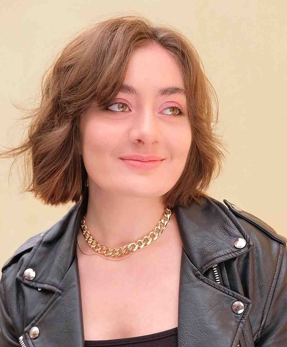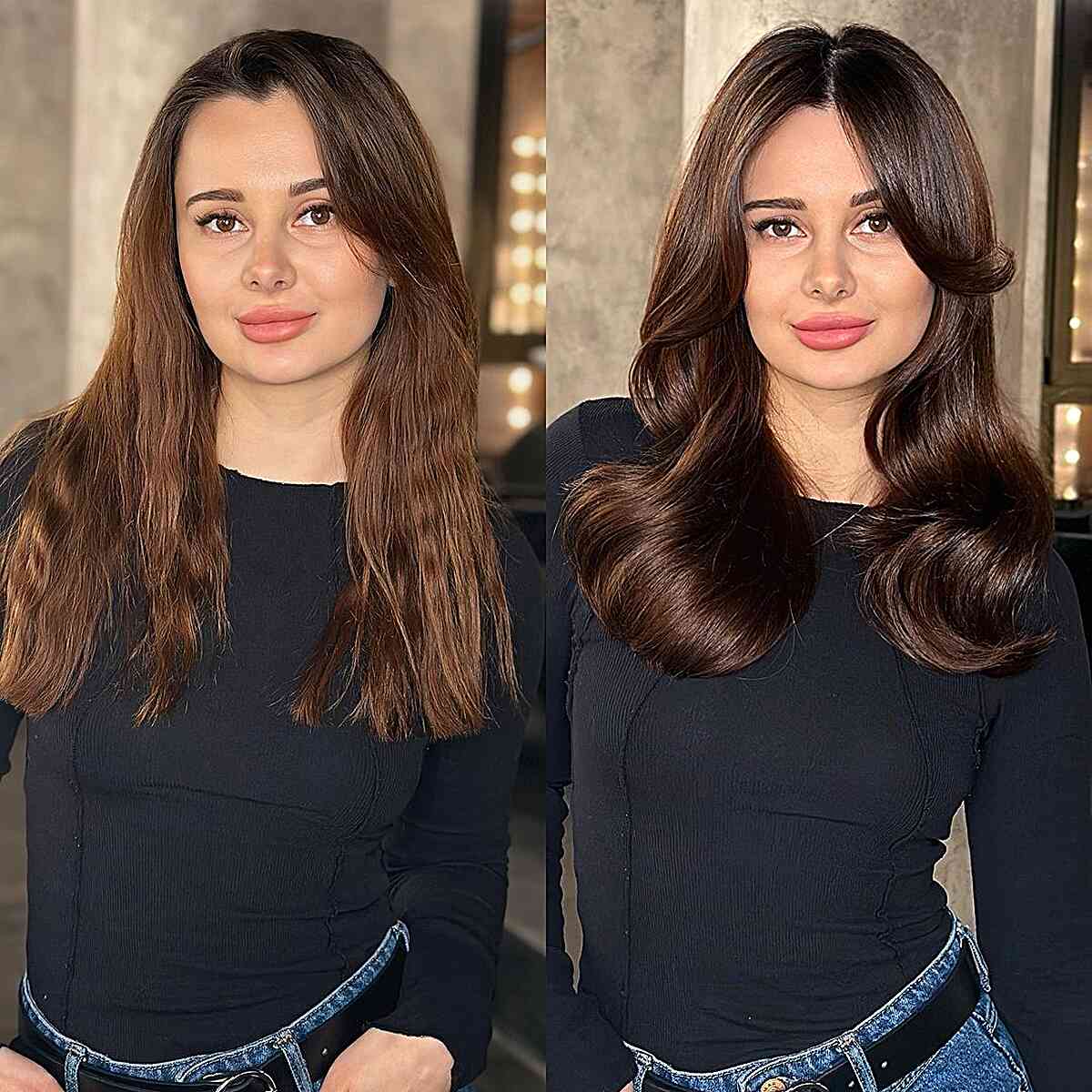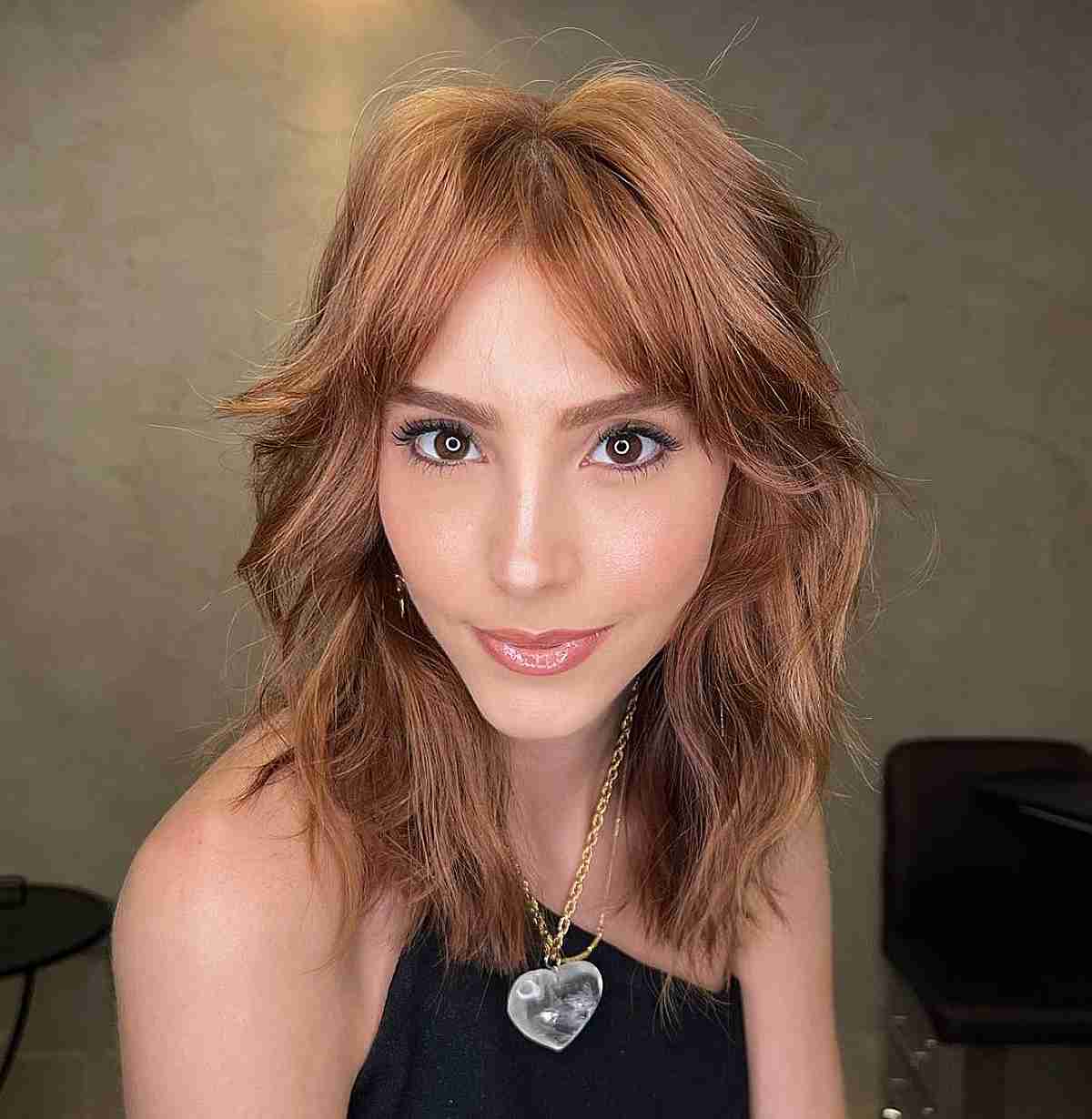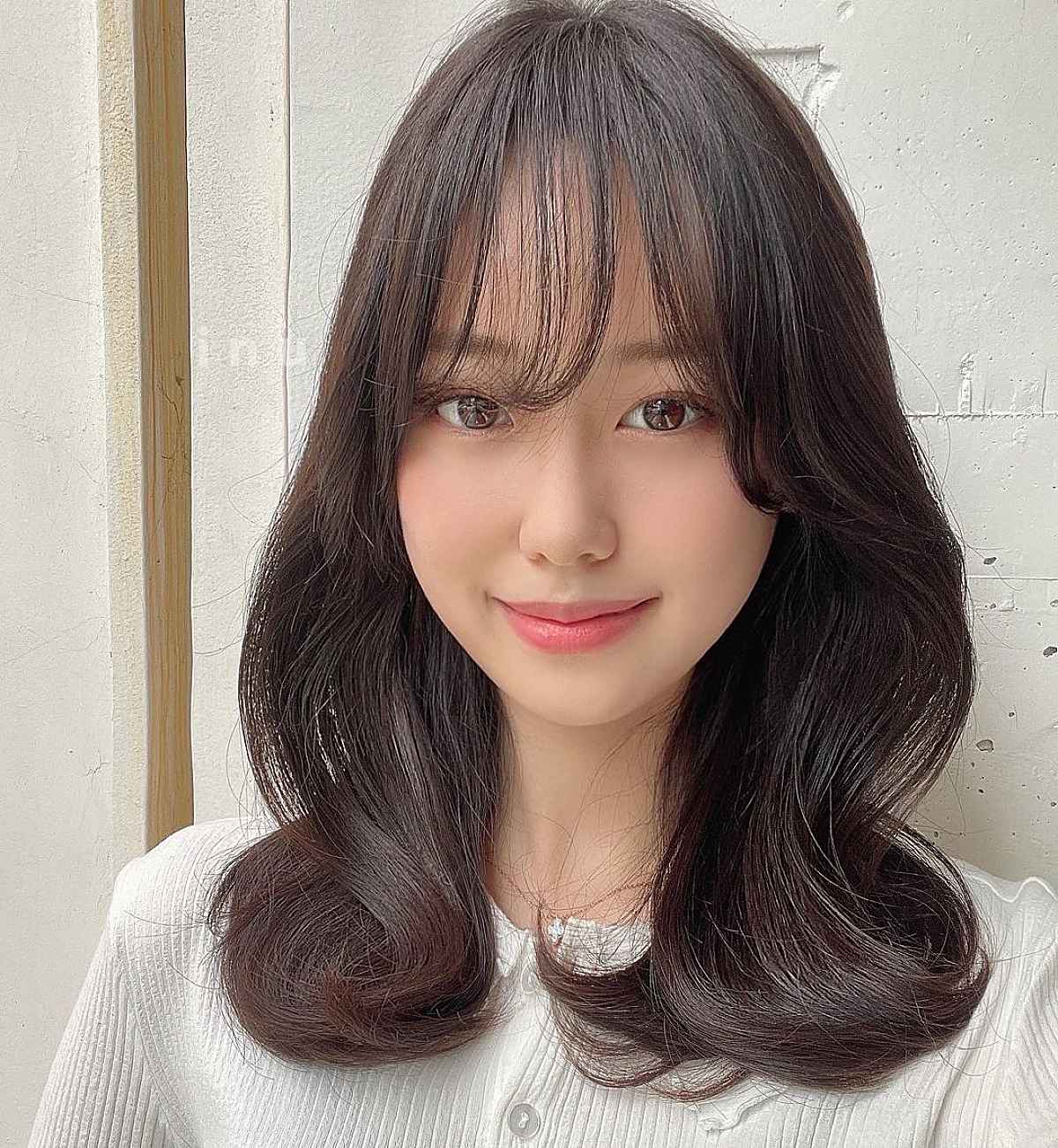 If you’re looking to achieve a softer appearance for a rounder face, a full fringe works beautifully. Yet, a curtain fringe remains an excellent option. It has a gentler look and grows out gracefully between trims. Chest-length hair strikes a perfect balance. It’s not too long and won’t weigh down the overall aesthetic.