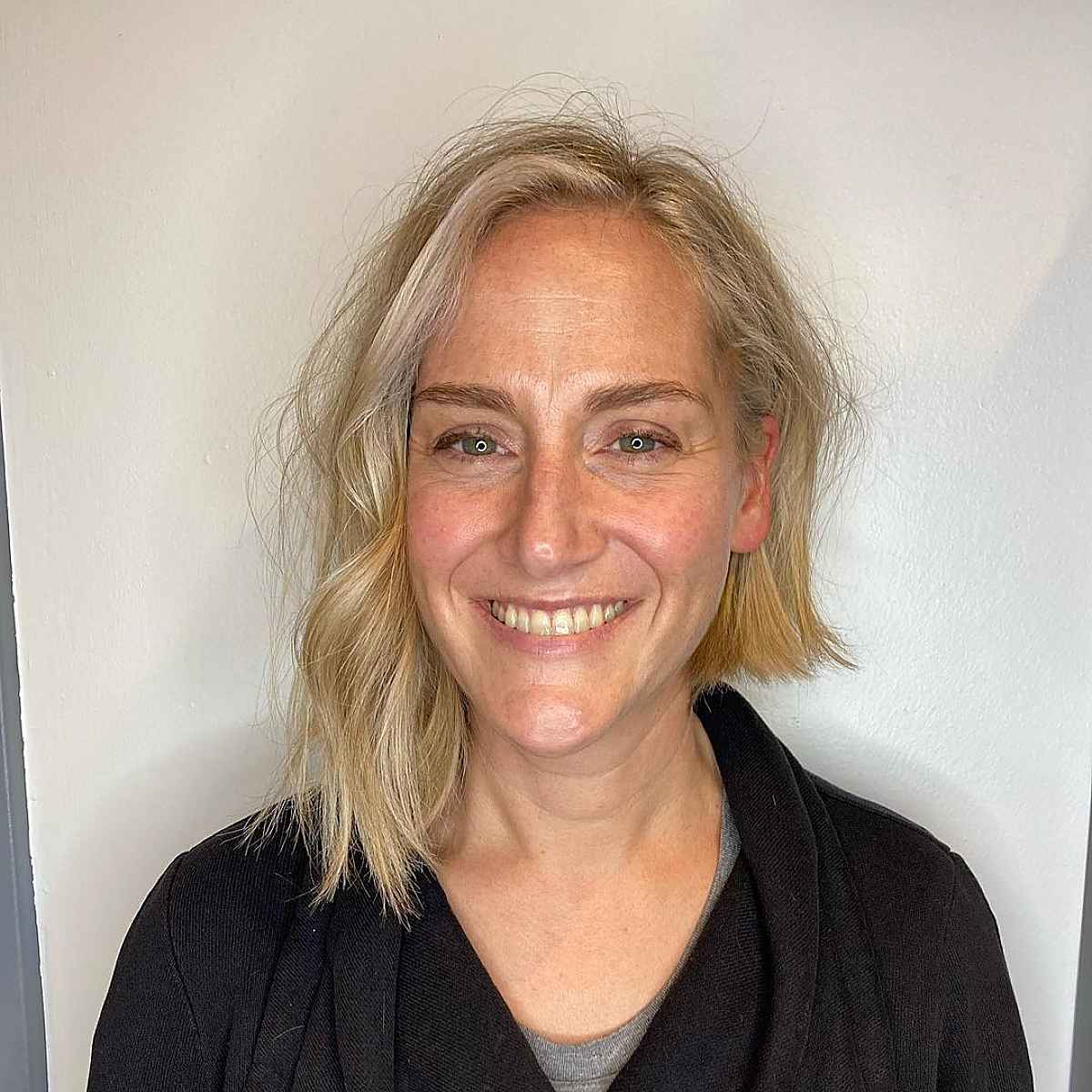 Add a long curtain fringe to your light blonde bob haircut. It brings elegance and versatility. Face-framing layers introduce softness to your features. They also enhance the volume and fullness of your hair. Use lightweight, body-enhancing shampoos, conditioners, and styling products if you have fine hair. They contribute to body without weighing your hair down.