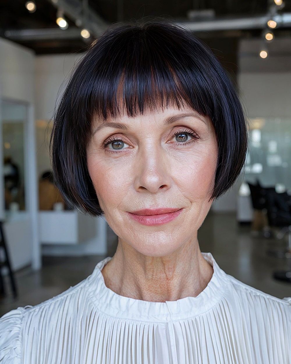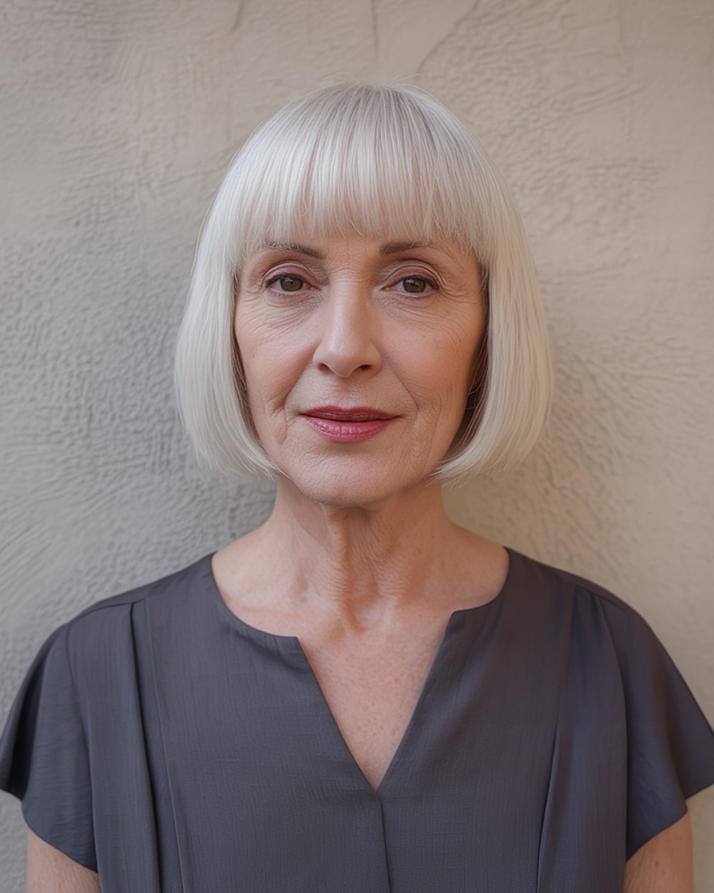 This crisp chin-length French bob is elevated with wispy, choppy bangs that fall just above the brows. Ideal for women over 60 with straight, fine hair, it gives structure and personality without needing much styling. The clean perimeter adds sharpness to round and square faces, while the short bangs draw attention to the eyes. It’s a chic, modern take with minimal layering—best worn sleek.