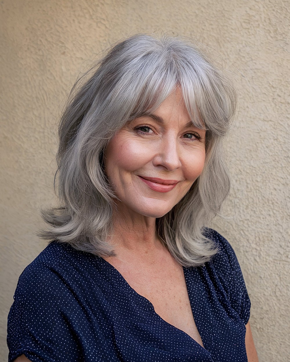 Embracing your natural silver can be stunning, as demonstrated by this chic, mid-length style with feathered wispy bangs that softly frame the face. The cut brings attention to the eyes and balances well with a heart-shaped face. These bangs add a playful touch while offering versatility—they can be swept aside or styled straight. For those with fine hair, this look creates an illusion of volume, but bear in mind that light bangs require regular styling to maintain their shape. This style, with its layers and texture, offers movement, making it an appealing choice for mature women seeking a fresh yet manageable look.