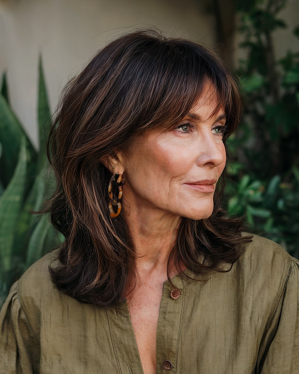 Soft, face-framing curtain bangs open up the face in this medium-length, layered cut—perfect for older women with naturally fine to medium density hair. The feathering around the cheeks subtly lifts the face and adds airiness, which works well for oval and heart-shaped faces. It’s low-maintenance but still full of movement, especially with a round brush blowout. The dimensional brunette shade adds youthful depth.