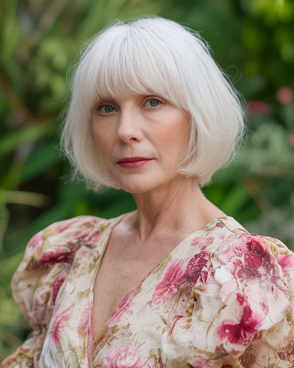This classic rounded bob paired with blunt, eyebrow-grazing bangs offers timeless elegance. The platinum-white color enhances cool undertones and makes thinning hair look fuller. Perfect for older women with delicate facial features and fine hair density, the full bangs hide forehead lines and accentuate the eyes. Its balanced shape flatters square and heart faces. Regular trims are needed to maintain the curve.