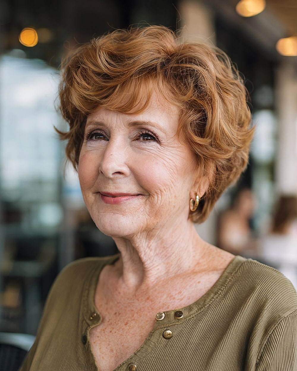 This playful pixie has lots of texture and movement, especially with those side-swept bangs that blend seamlessly into soft waves. The volume at the crown flatters fuller face shapes and gives lift to aging hair. Ideal for thick, naturally wavy or permed hair, the cut helps reduce bulk while still maintaining body. The tousled finish adds personality, though humidity might require a light mousse or styling cream to keep it shaped. It’s particularly flattering for women over 60 who want a wash-and-go cut with sass.