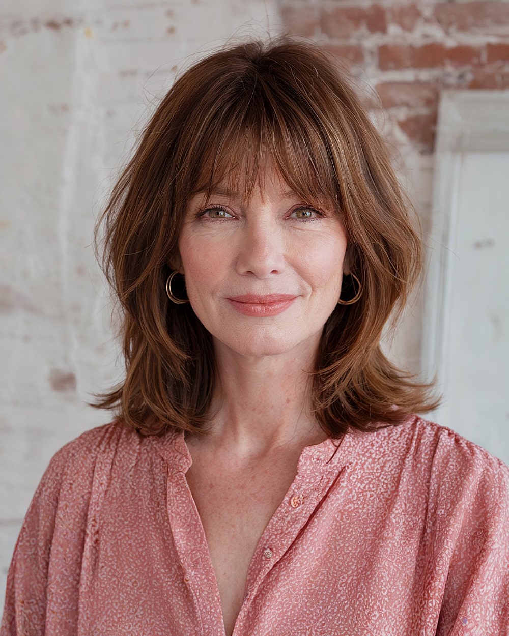 A layered cut that’s perfect for women over 50, offering volume where it’s needed and framing the face beautifully with feathered edges and wispy bangs.