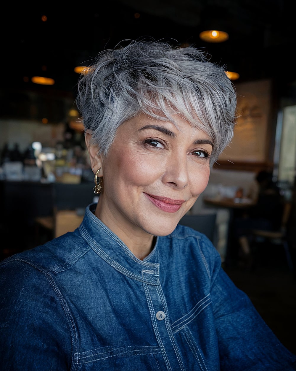 With its tousled texture and tapered fringe, this modern pixie brings energy to aging hair, especially for women with thicker strands. The soft silver hue plays beautifully with the choppy layers, adding volume at the crown and lightness around the ears. It suits petite to medium faces, and the swept-forward bangs soften forehead lines naturally. A little texturizing paste keeps it fresh daily.