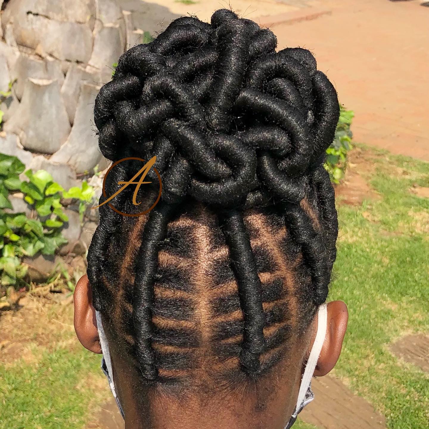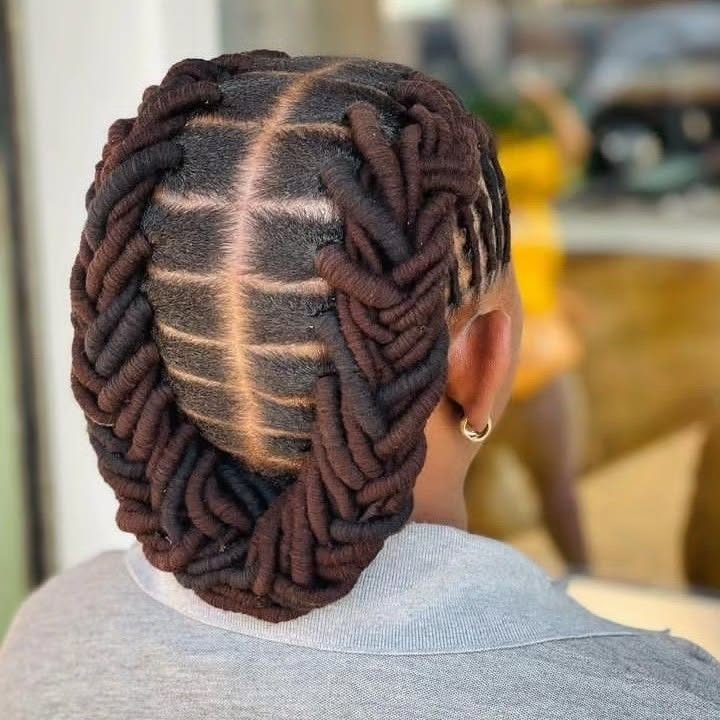 This stunning hairstyle features rolled locs styled in a defined pattern, perfect for showcasing your natural texture. The hair is medium-length with a dense, coiled texture, creating a beautiful visual interest. This look is great for those with oval or heart-shaped faces, as it frames the face elegantly. While this style offers a low-maintenance option and protects your natural hair, it may require a bit of time to install. The unique twist here is the precise sectioning, which adds an artistic flair not commonly seen, making it a standout choice for any occasion.