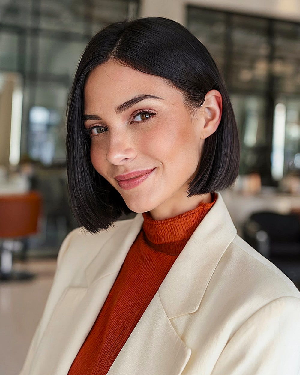 Glossy, smooth, and undeniably polished, the glossin bob features a chin-length blunt cut with softened corners and a mirror-like finish. Its slightly rounded shape hugs the jawline and complements symmetrical facial features beautifully. Best for straight, fine to medium hair that holds shine well. This look relies on perfect styling—flat ironing and shine serums are a must. It’s a chic option but high-maintenance if your hair is prone to frizz or dullness.