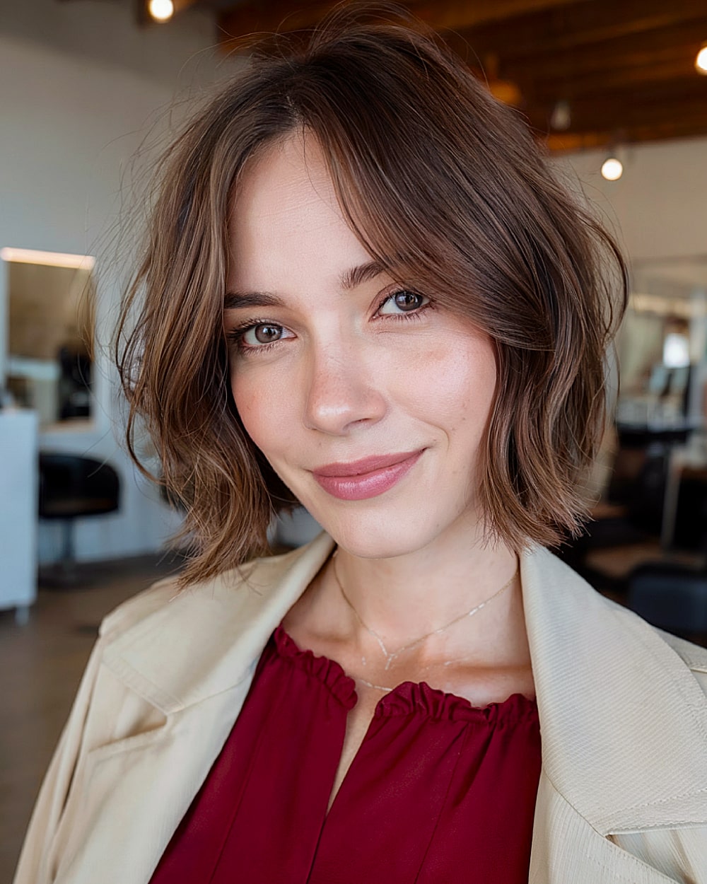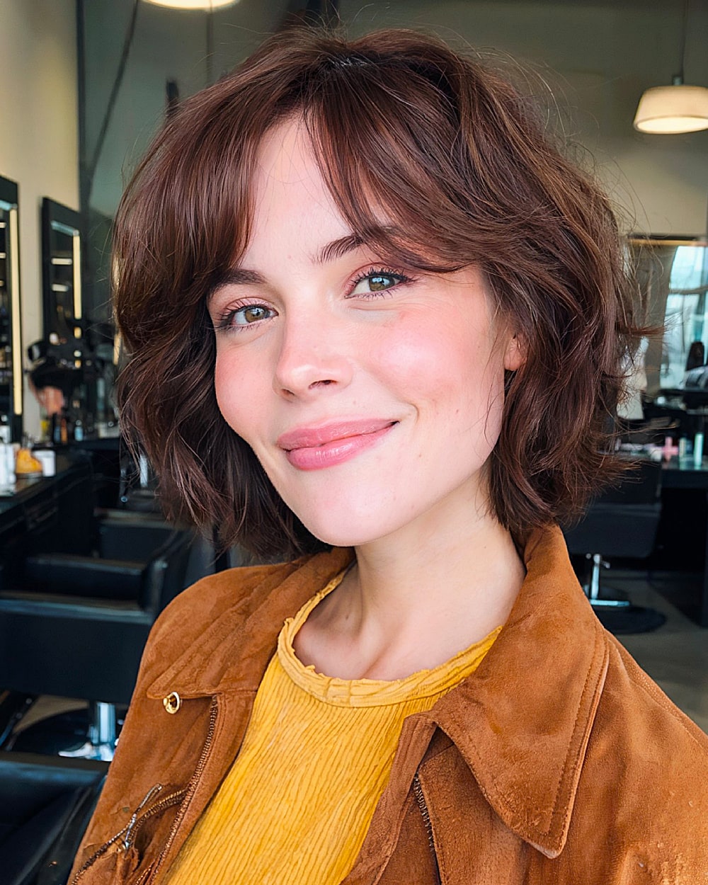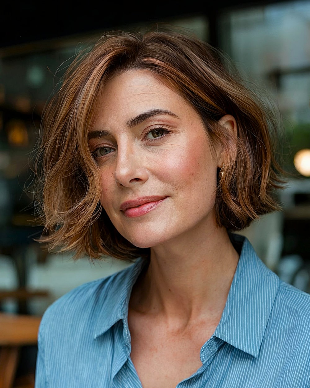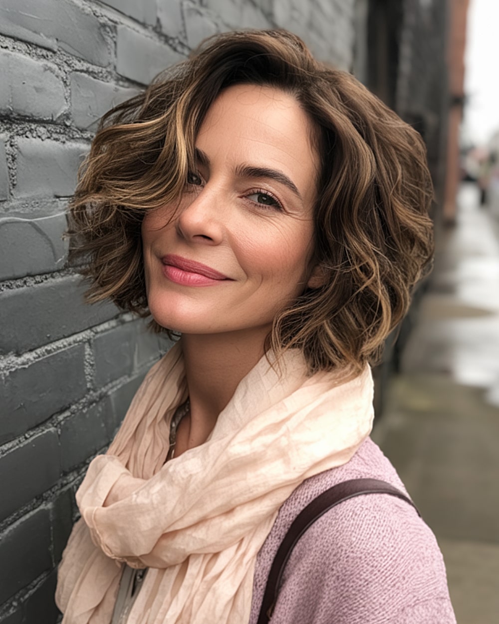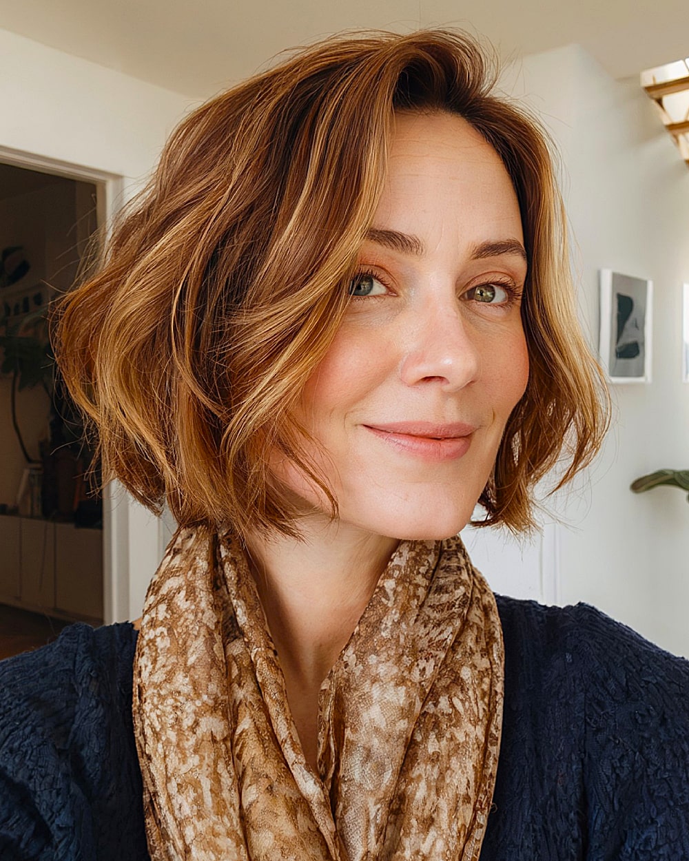 Balanced and versatile, this bob brings in light face-framing layers to soften the overall look. The gentle waves add texture and volume, making it great for medium to thick hair. The shape flatters just about any face, especially if you’re aiming to draw attention to the eyes and cheekbones. It’s a casual yet refined choice that doesn’t feel too “done.” Use a curling wand or flat iron bends to bring out those layers.