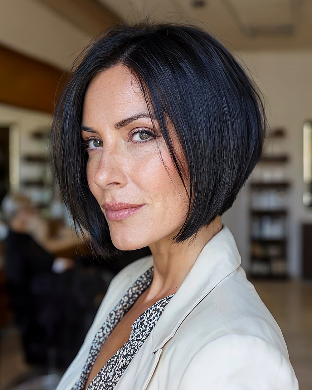 This inverted bob gives a sharp, modern edge with its tapered back and elongated front. It flatters most face shapes but works especially well for those with a strong jawline or longer neck. Fine to medium straight hair is best to keep the silhouette crisp. The stacked back adds subtle lift, while the front grazes the chin for softness. Maintenance is key here—it loses its impact as it grows out, so frequent shaping is a must.