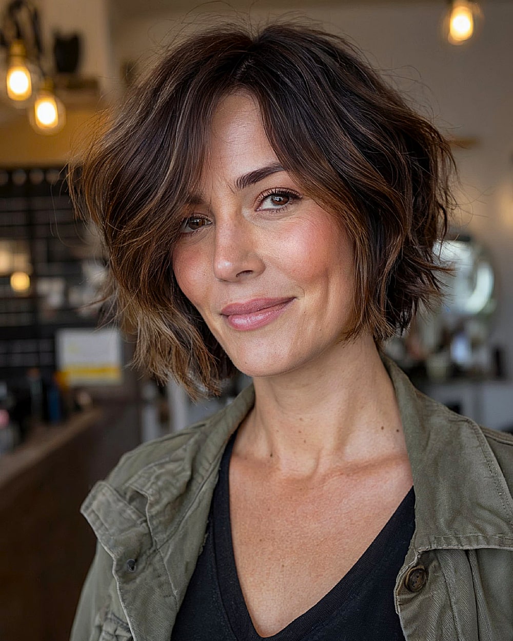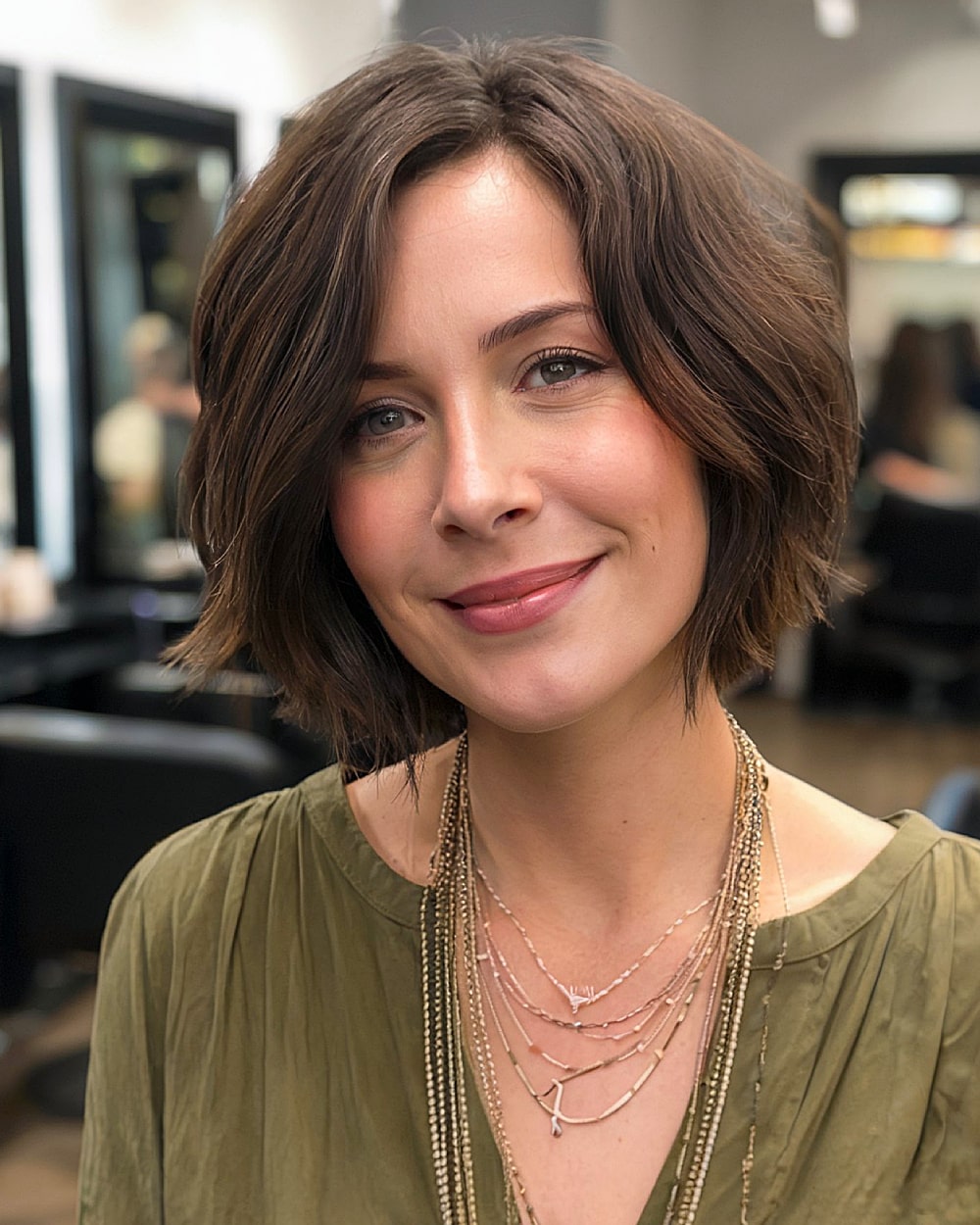 Edgy and full of texture, this chin length bob is all about movement. The choppy ends and tousled layers work beautifully for women with medium-density, naturally wavy hair. Great for oval or heart-shaped faces, the style adds lift and volume without needing constant styling. However, it can feel bulky if your hair is ultra thick or coarse. The subtle bend near the cheekbones frames the face nicely and gives it a soft, playful finish.