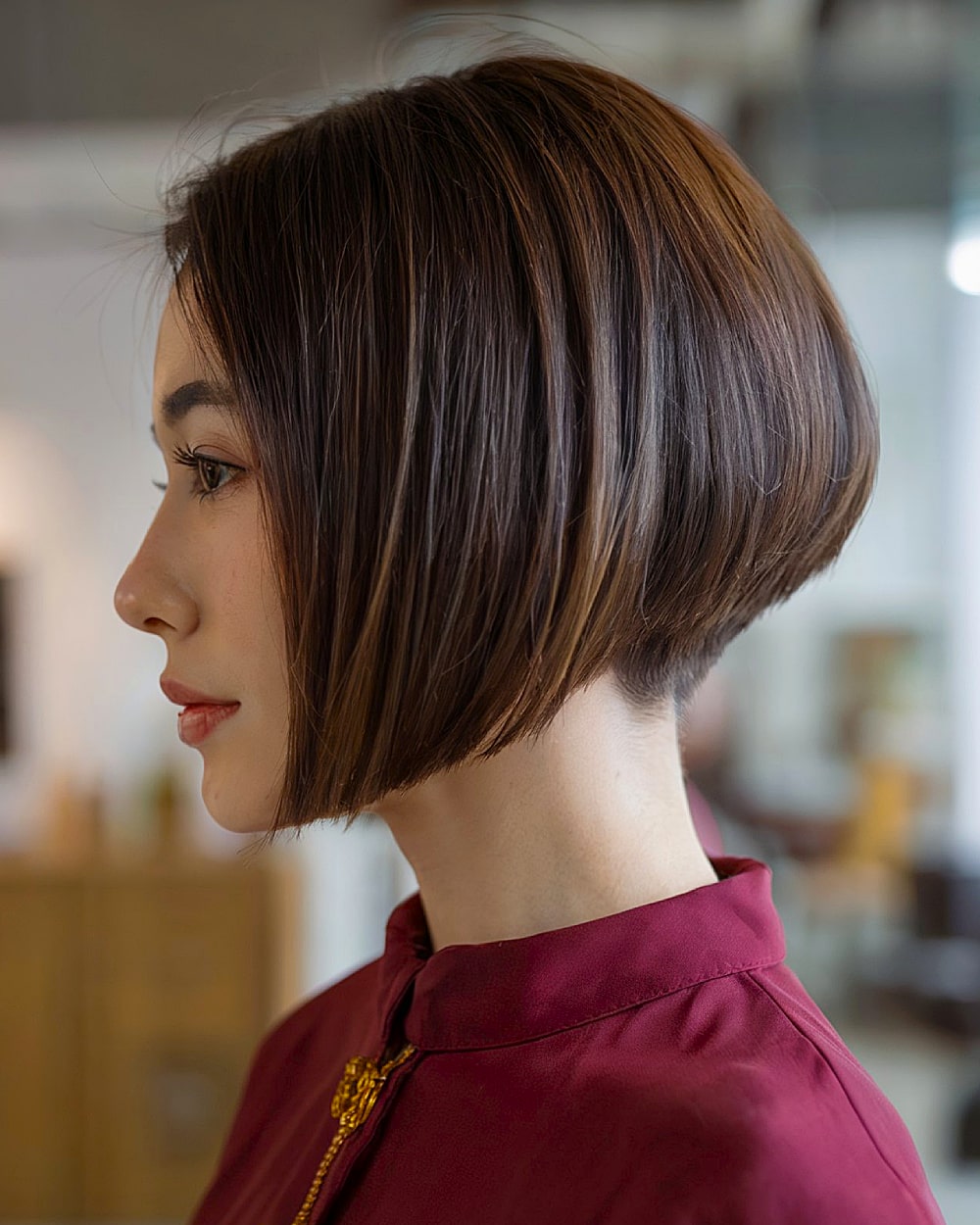 This architectural chin length bob features a bold undercut at the nape with a stacked back that gives maximum structure and lift. It’s ideal for straight, medium to thick hair and suits those with long necks and balanced facial proportions. The sharp taper keeps the neckline clean and modern, while the sleek front panels elongate the jawline. Downsides? It needs precision cutting and regular trims to maintain that dramatic, sculpted shape.