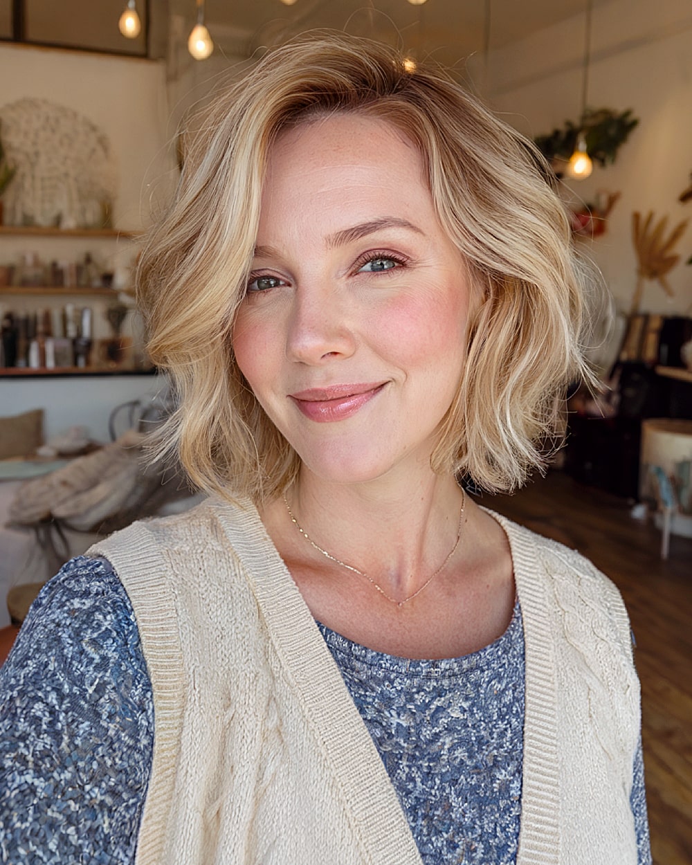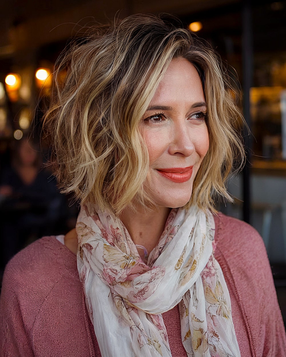 Laid-back yet flattering, this chin length bob with loose waves gives effortless volume and softness. Best for medium to thick hair types, especially with a natural wave pattern. The messy finish adds fullness around the jawline—great for longer or angular faces. Dimensional blonde highlights throughout give a beachy brightness. Keep in mind: this look needs product to hold texture and could puff up in humidity if your hair is prone to frizz.