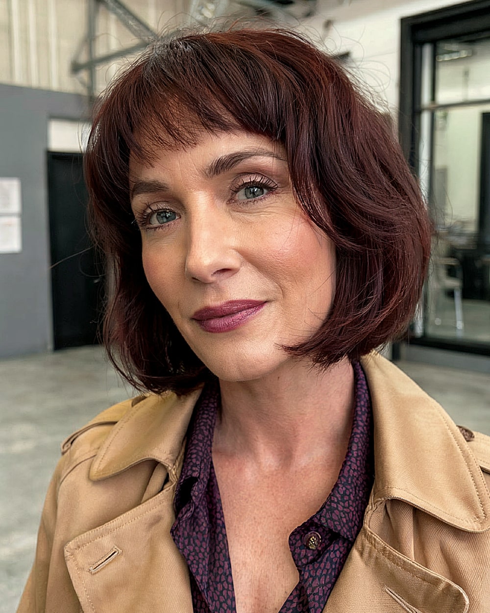 Classic with a twist, this French-inspired chin length bob features soft micro bangs and rounded volume. It’s especially flattering on fine to medium hair and works well for angular or narrow face shapes. The gentle bevel at the ends helps the cut hold shape without much styling. Downsides? Bangs need frequent trims and styling. But it adds instant personality and can be a youthful refresh, especially for women in their 40s and 50s looking for a soft, artsy feel.