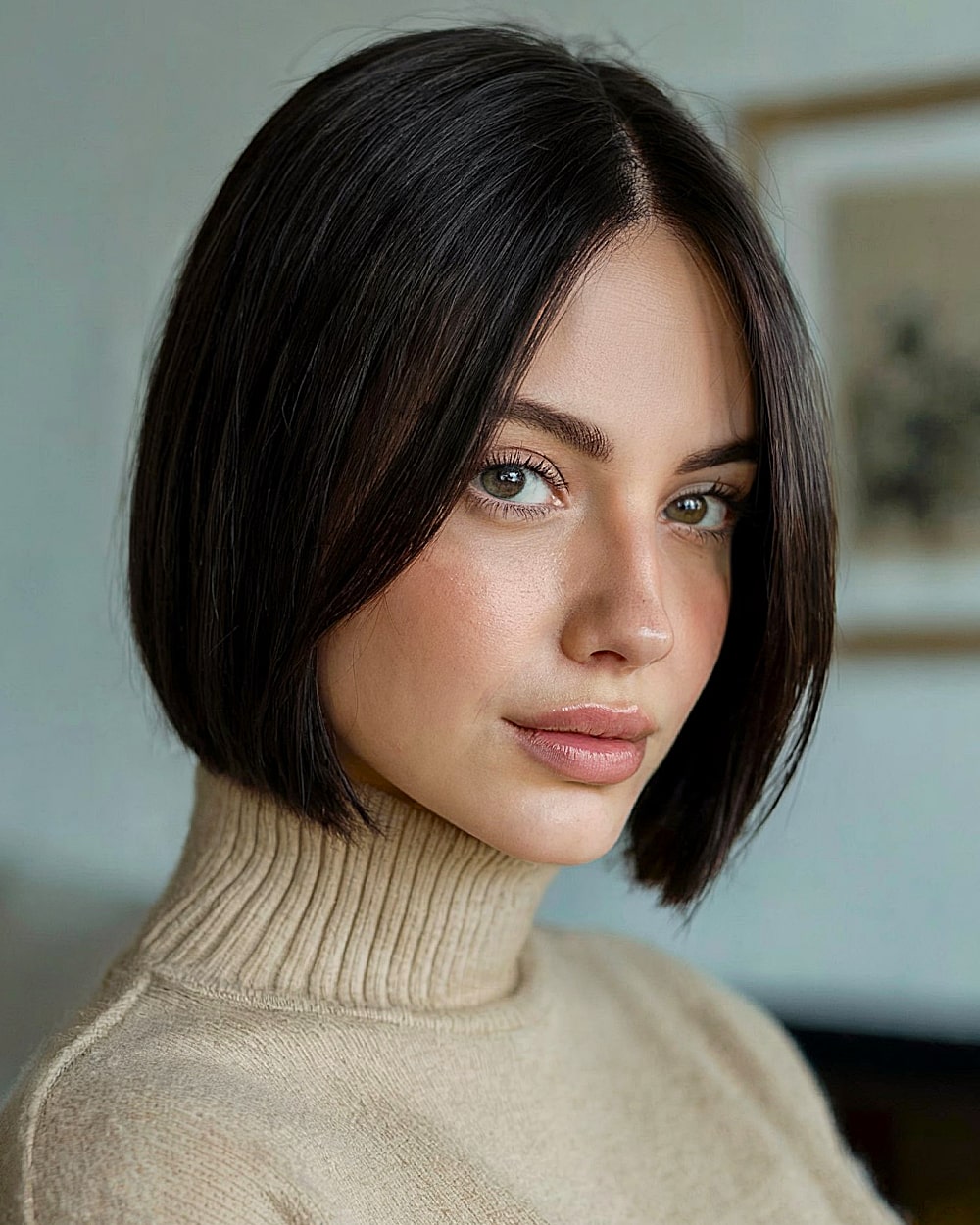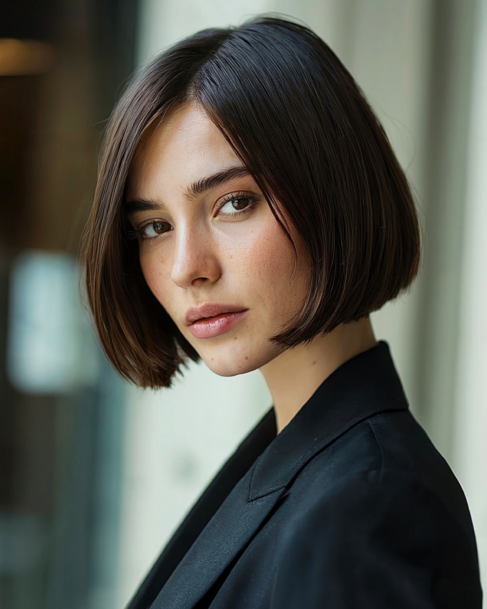 Polished and ultra-sleek, this chin-length bob is all about precision and shine. The blunt cut hugs the jawline perfectly, enhancing oval and heart-shaped faces, while the silky, dark brunette strands reflect light beautifully thanks to a high-gloss finish. Best for straight, medium-density hair, this look delivers a crisp, professional edge with low visual bulk. The clean center part keeps things balanced, but be aware—it exposes the face fully, so it’s less forgiving if you’re trying to soften strong features. Ideal for women in their 20s to 40s looking for structure and simplicity.