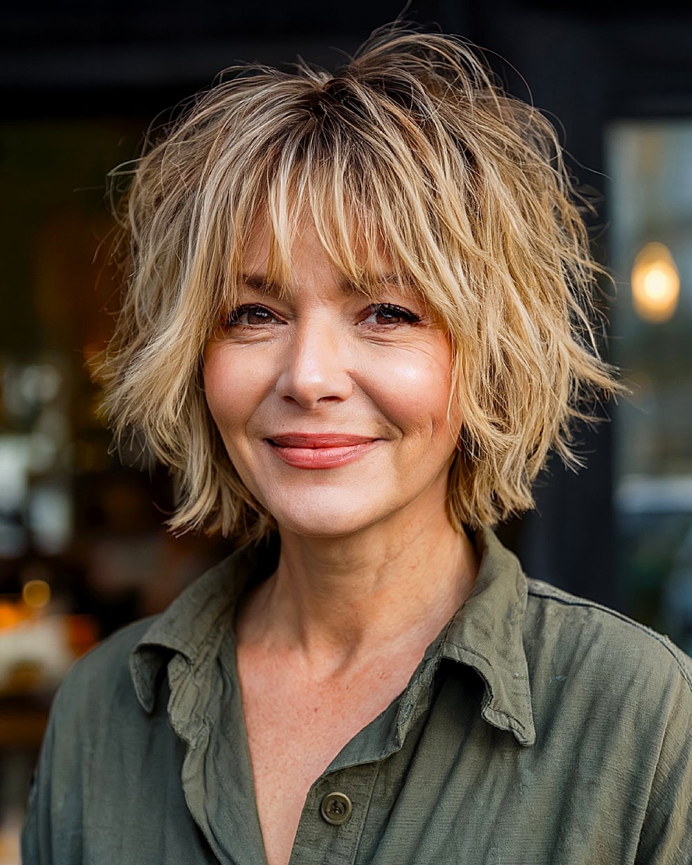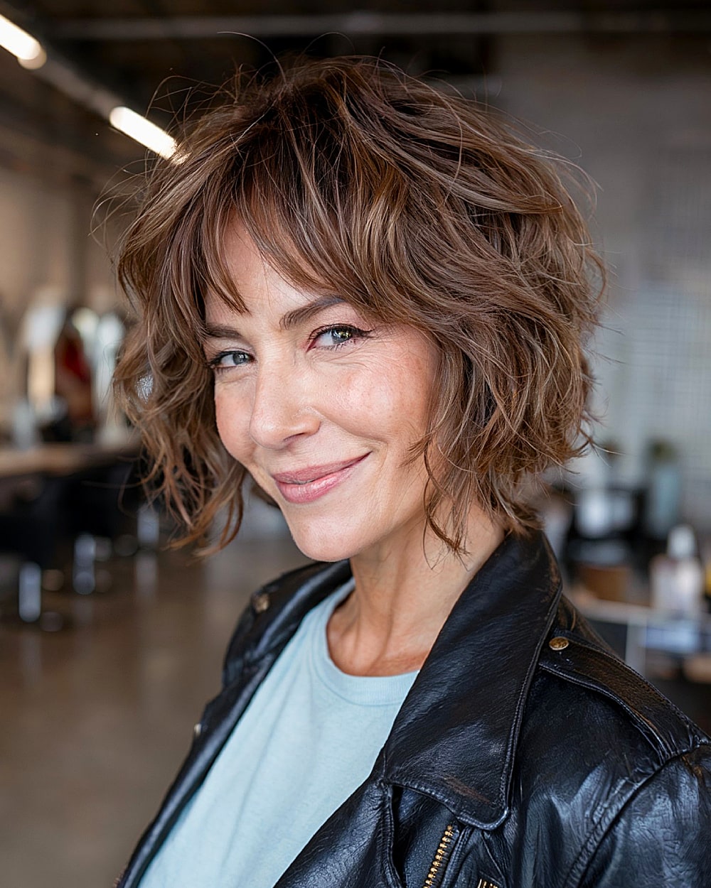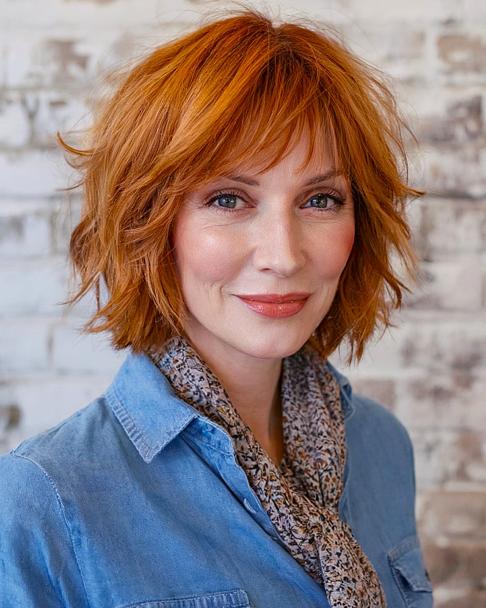 Bold and textured, this shaggy bob hits right at the chin and is loaded with choppy layers. The full fringe helps balance longer or more angular face shapes while the layers boost volume on medium to thick hair types. It’s a great choice if you want a messy, carefree finish. Downsides? It can get poofy in humidity, and those fringe pieces will need regular shaping. Use a texture paste or salt spray to keep the definition alive.