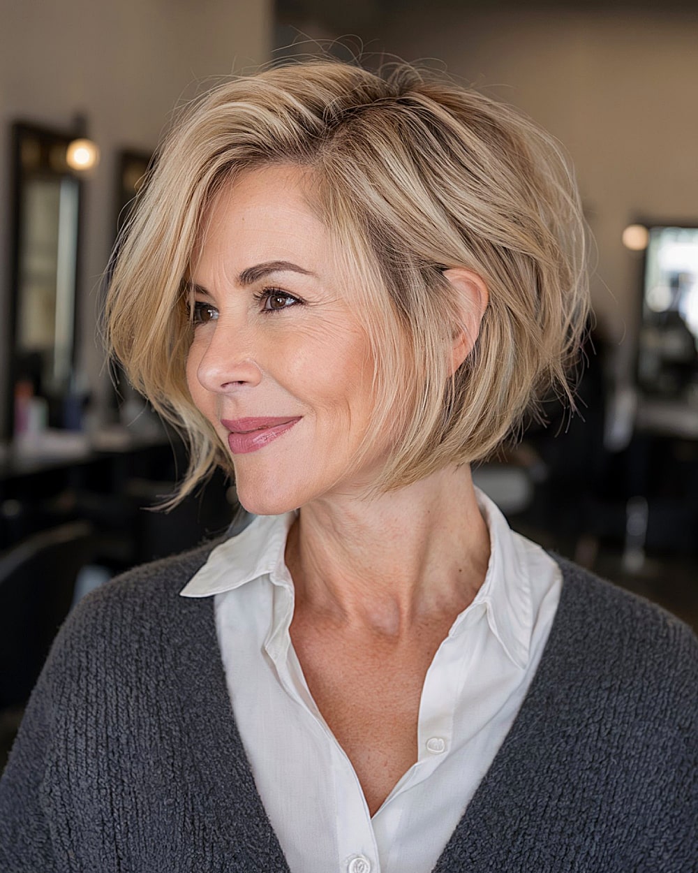 This stacked bob creates instant crown volume with expertly layered graduation at the back. It works wonders on fine or thin hair by adding shape and fullness. The front remains sleek and chin-hugging, perfect for elongating the neck and lifting the jawline. Not ideal if your hair is super thick or prone to poufiness—it can look too rounded. But for mature women wanting youthful lift and structure, it’s a solid option.