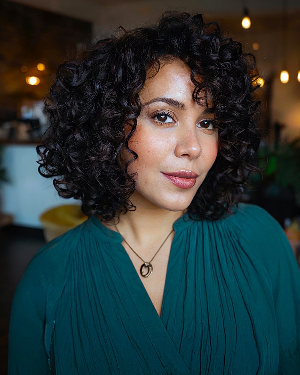 Full of bounce and definition, this chin length curly bob celebrates natural texture. It’s shaped to enhance volume at the sides and back, which is perfect for curly girls with medium to high density. The cut avoids bulkiness at the ends thanks to some strategic layering. It’s a fantastic wash-and-go option but does require moisturizing products to maintain those tight, defined ringlets. Best for oval, long, or diamond-shaped faces.