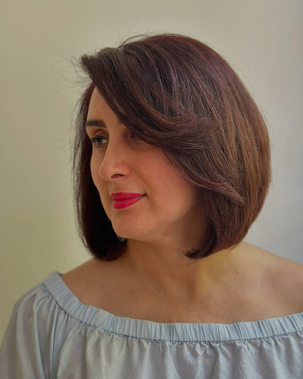 Flattering and full of body, this side-swept voluminous bob is perfect for women over 40 with medium to thick hair. The cut sits just above the shoulders, and the deep side part with soft, graduated layers helps lift the crown and frame the face beautifully—especially if you have a round or heart-shaped face. It adds youthful fullness but may require blow-drying and a round brush to maintain the shape daily.
