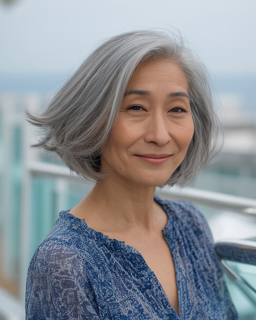 This gray layered bob with a side part is perfect for women over 50 looking for an age-defying, low-maintenance style. The soft layers add natural movement and fullness to fine hair, while the side part helps create flattering volume at the roots. This cut works especially well with naturally gray or silver hair, enhancing its shine. It’s ideal for those seeking an elegant yet manageable look that’s easy to style with a round brush and minimal product.