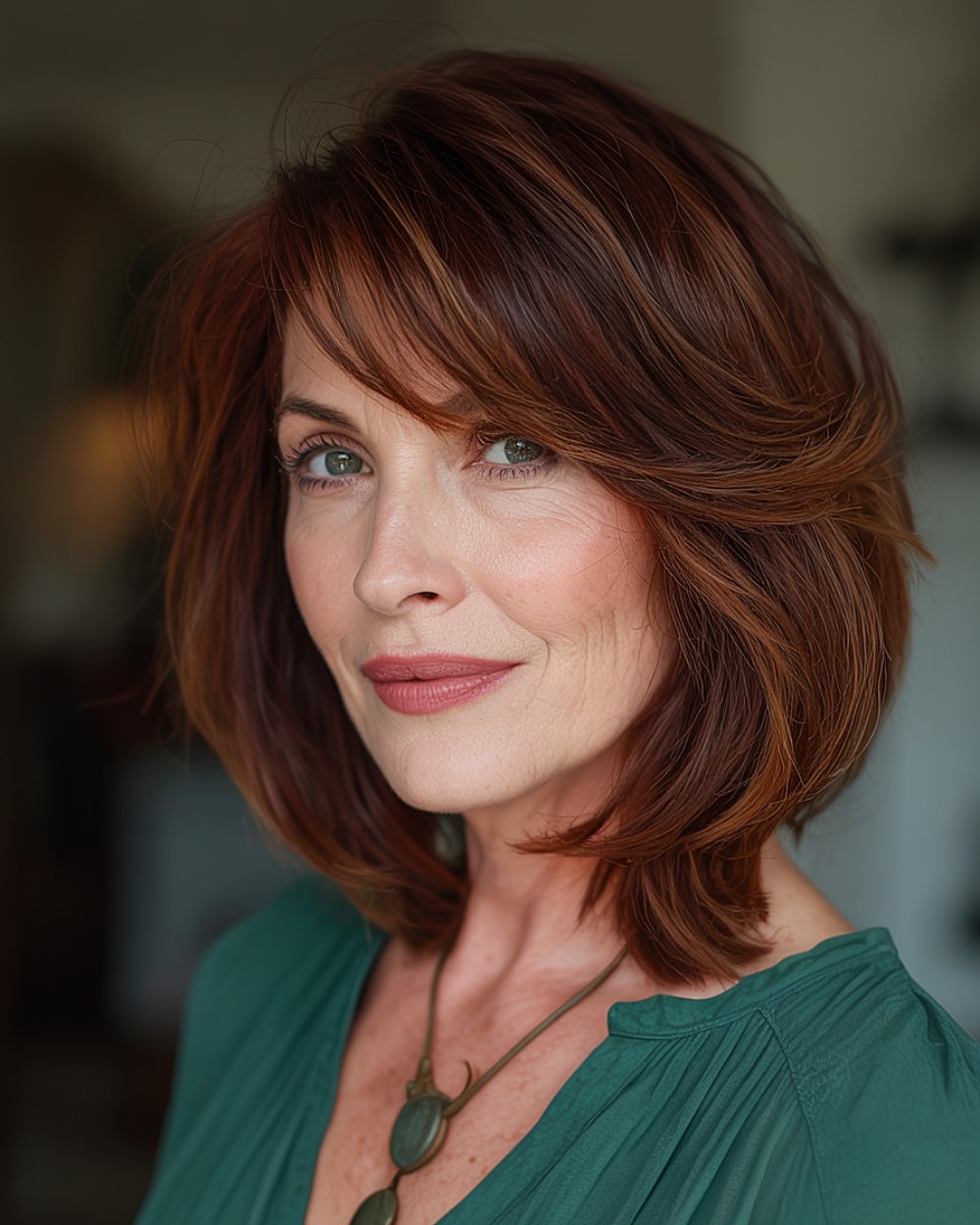 This medium-length layered bob is perfect for women over 50 who want a fresh, low-maintenance cut with some volume. The soft layers add movement and fullness, especially for those with fine or thinning hair. The side-swept fringe frames the face beautifully, giving it a youthful lift. This style works best for straight to slightly wavy hair, but it can be styled easily with a round brush for a sleek finish.