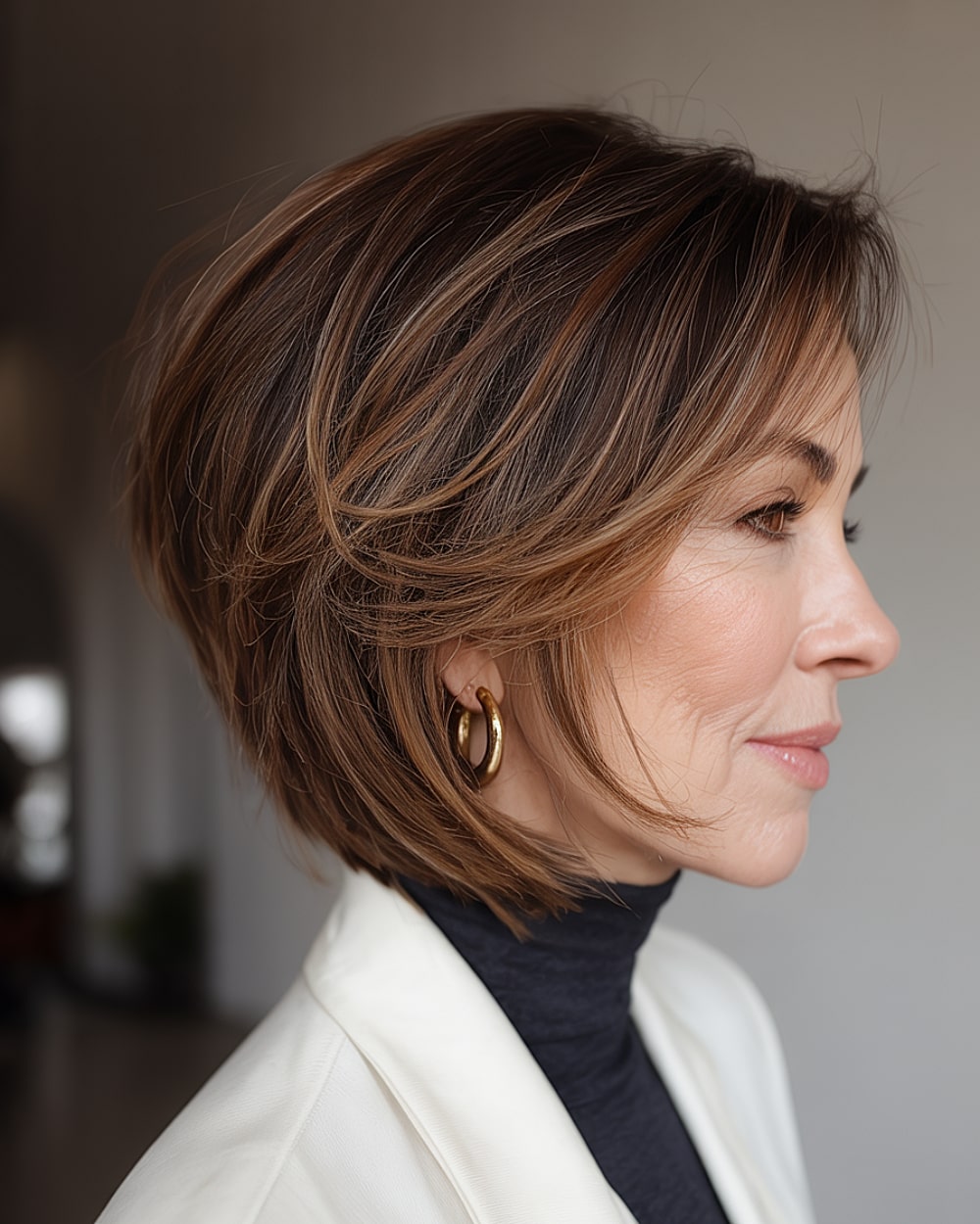 This short layered bob is a fantastic choice for women over 50 with fine to medium-thick hair. The soft, feathery layers create lightness and movement, while the side-swept bangs subtly frame the face, making it ideal for round or square face shapes. The tousled texture adds volume, perfect for thinning hair. Styling with a round brush gives it a polished finish, but the layered cut keeps it low-maintenance, making it easy to manage daily.