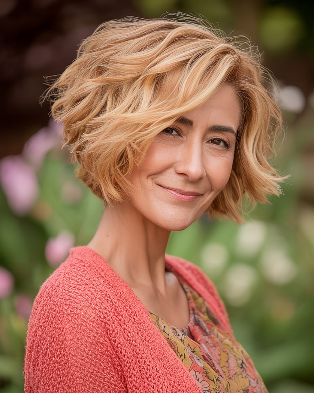 A blonde feathered bob with visible layers is a fantastic choice for women aged 50. This hairstyle can add movement and volume to the hair, making it appear fuller and more dynamic. It also gives a more youthful look as we age. This feathered texture creates softness and movement. As a result, the hairstyle takes on a youthful and feminine feel. The color blonde enhances the layered effect, adding depth and bringing out the different lengths of the cut.