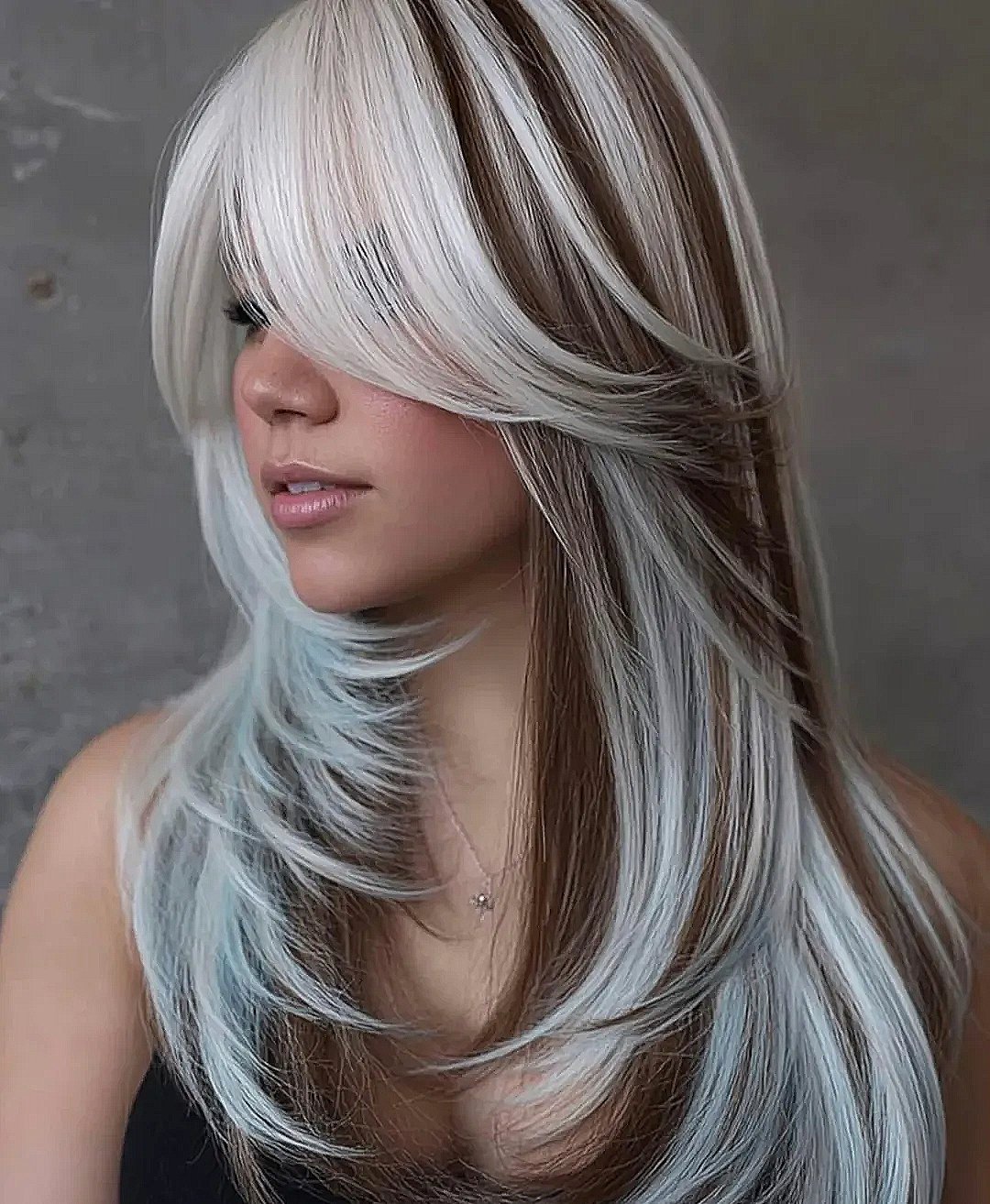 This stunning hairstyle features long, flowing layers with a captivating blend of brown and platinum blonde, accented by icy blue highlights. The soft layers provide movement and dimension, making it suitable for various face shapes. Ideal for medium to thick hair types, this look requires regular styling to maintain definition. The unique color combination creates a fresh, modern appeal, perfect for those looking to add a pop of color without overwhelming their natural tones.