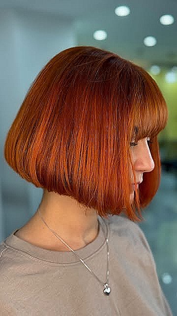 This vibrant copper orange bob features a sleek, chin-length cut with blunt bangs, perfect for fine to medium hair types. The bold color adds warmth and dimension, making it a fantastic choice for round or oval face shapes. Styling is minimal; a smoothing serum can enhance the shine and tame any frizz. This haircut is distinctive for its sharp lines and rich hue, offering a fresh look that’s easy to maintain while ensuring a modern, playful aesthetic.