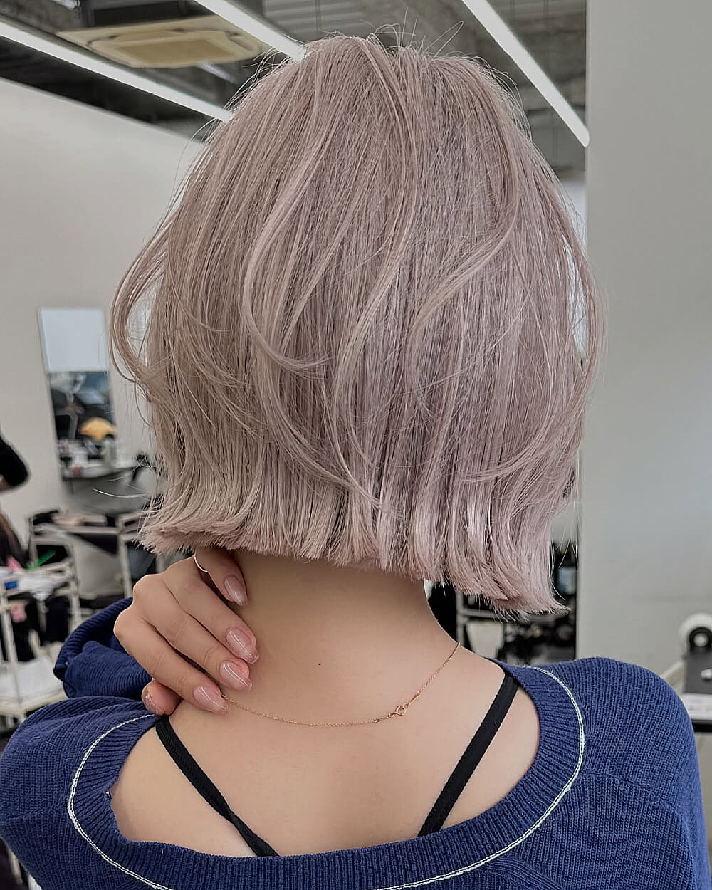 A textured blunt bob in a cool ash blonde tone brings a modern edge to light blonde hair color. The cut sits just above the shoulders with blunt ends that add strength, while soft, airy layers keep it from feeling too heavy. This look works beautifully on fine to medium hair since the texture creates natural movement and fullness. It flatters oval and heart-shaped faces but can be less forgiving on very round shapes. The light ash blonde shade requires upkeep to avoid brassiness, but when maintained, it gives a fresh, youthful finish that brightens the skin.