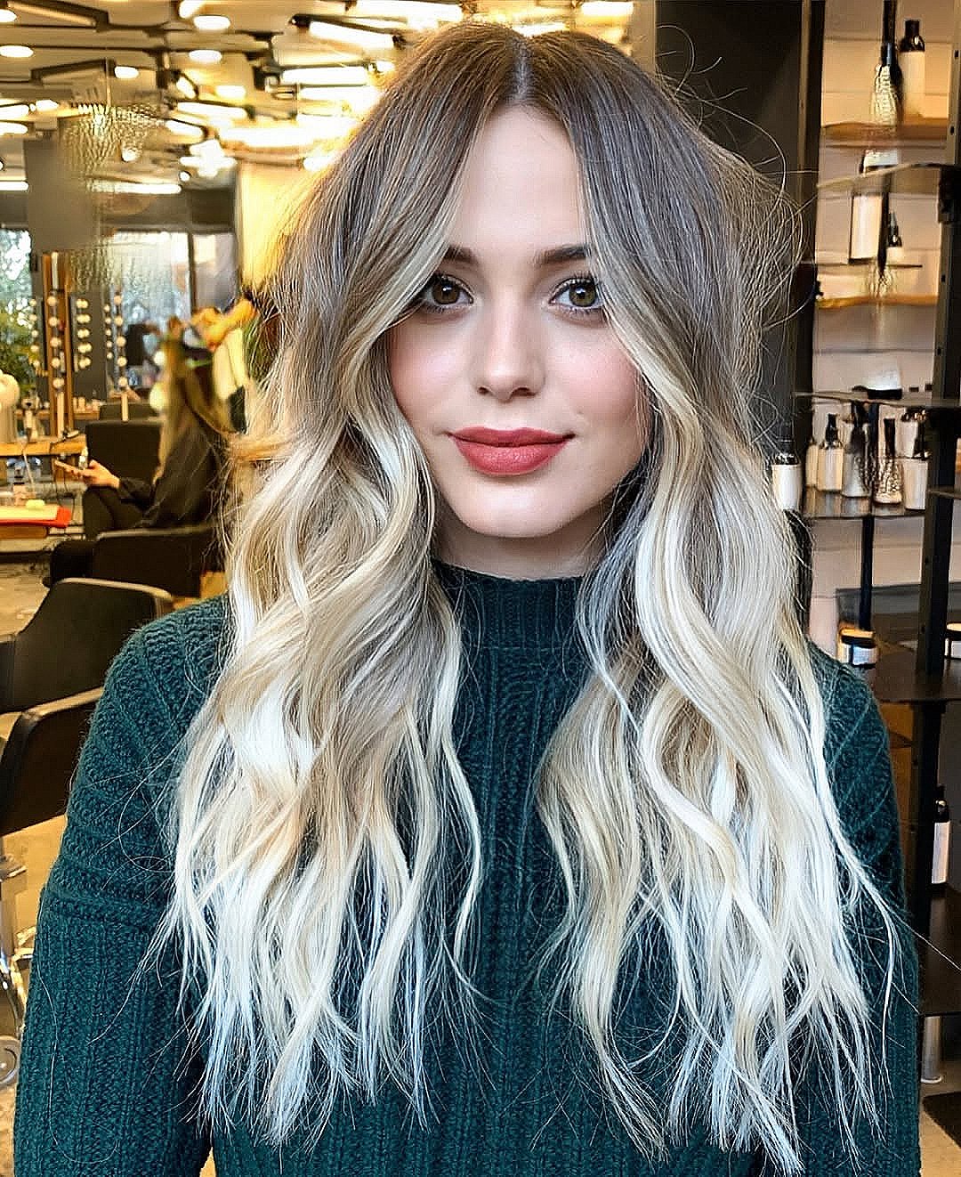 A pale blonde balayage with a root melt is trending for blondes. Your stylist can create big panels of bright blonde hair color, but keep your root seamless by melting a dark root color with your color glaze. Keep the root melt lighter or close to your natural color to keep this look low-maintenance. Always ask for stylist hair care recommendations to keep your blonde healthy at home.