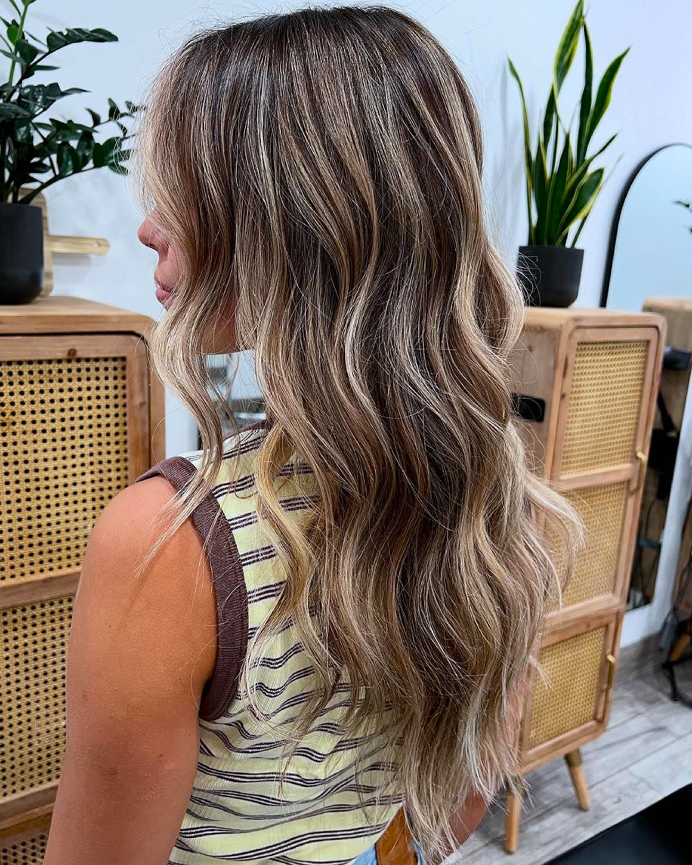 This rooted sandy blonde with creamy balayage blends cool and warm blonde tones for a sun-kissed, natural finish. The soft grow-out from the darker base makes it low-maintenance, while the hand-painted highlights brighten the ends and face. Great for long, thick hair with natural wave, it adds dimension and texture. The beachy waves bring out the tonal contrast beautifully without needing daily heat.